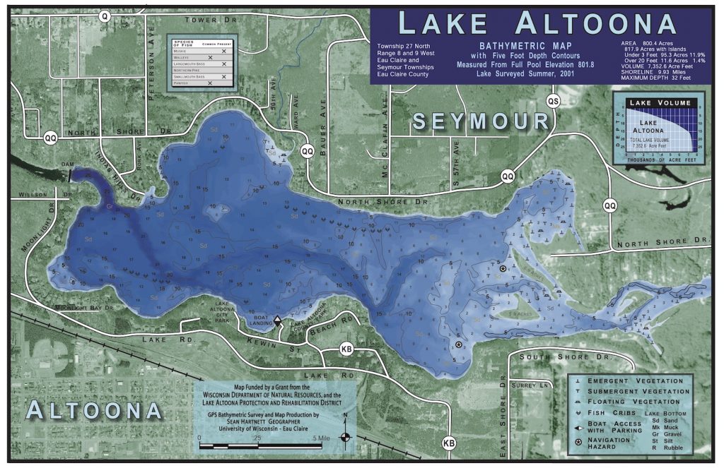 | Name | County | Area (Acres) | Max Depth (Feet) | Location | WBIC |