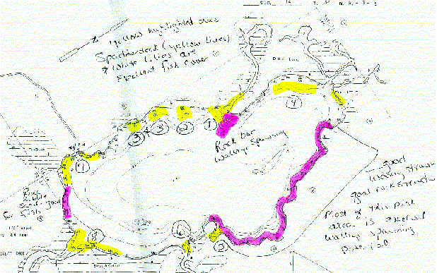 do proper mapping of the beds. We identified 8 beds of plants on the lake (see map). Based upon this site visit, a second visit in 2002 was scheduled.