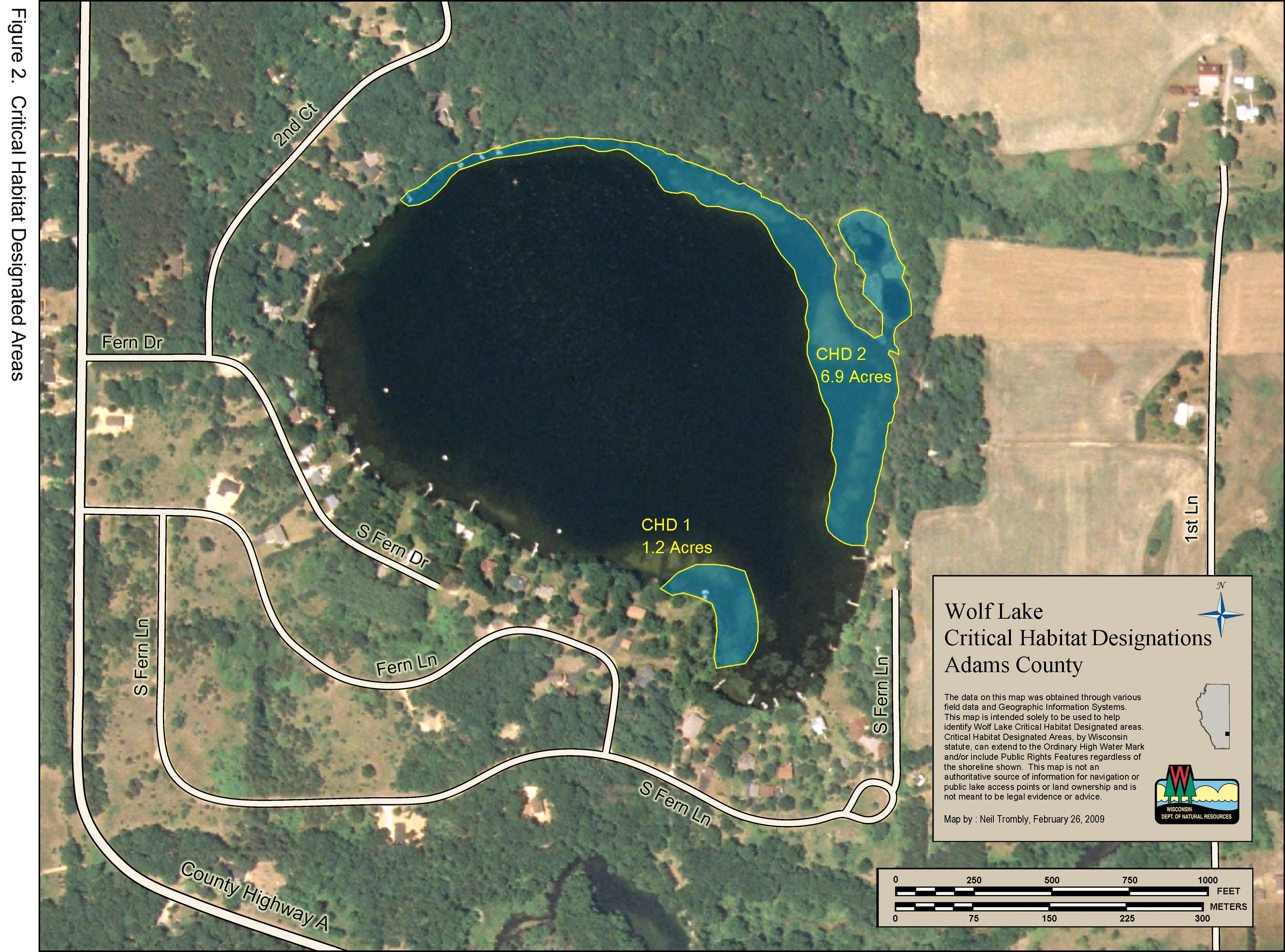 Field work for a critical habitat area study was performed on June 6, 2006, on Wolf Lake, Adams County. Areas were identified visually, with GPS readings and digital aerial photos providing additional information.