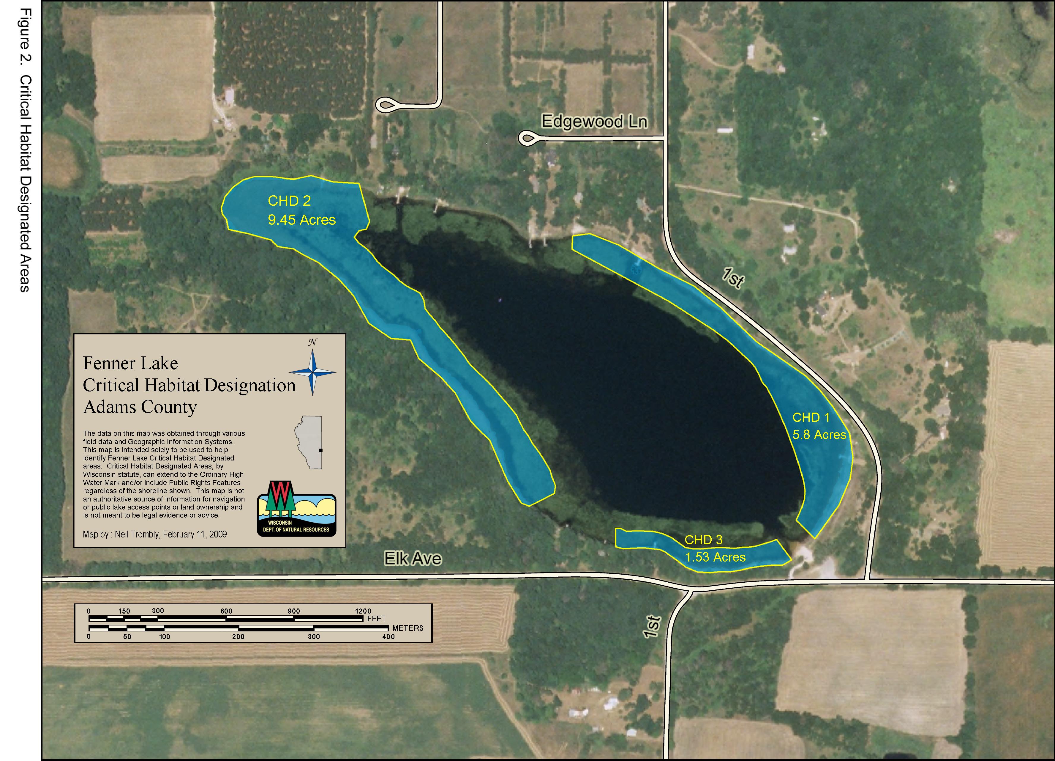 Field work for critical habitat area designations was performed on May 25, 2006, on Fenner Lake, Adams County. The designation team was assisted by aquatic plant and shoreline assessment data collected in July, 2005. Potential areas were identified visually, with GPS readings and digital photos providing additional information.