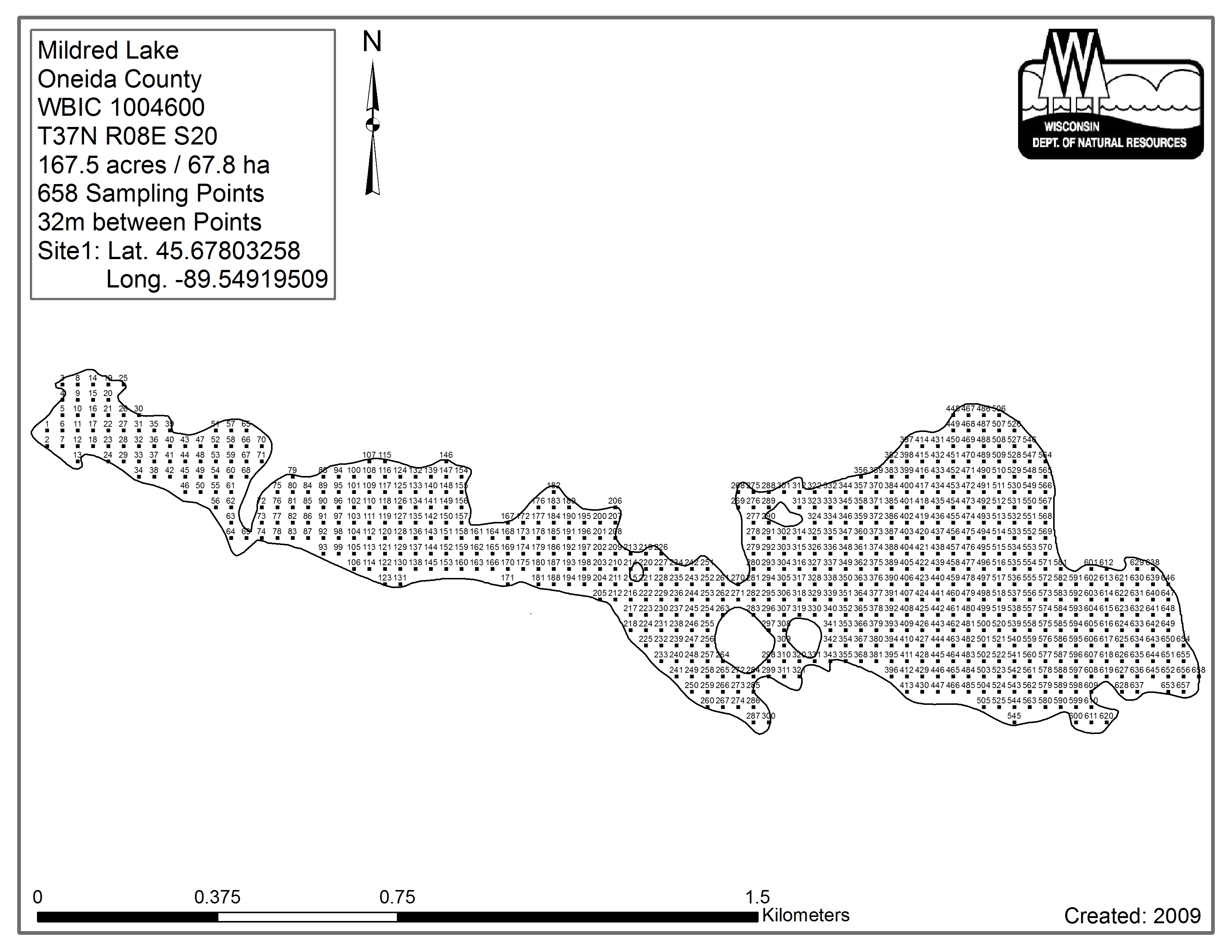 Mildred Lake, Oneida County - Aquatic Plant Sampling Map (32 mpts)