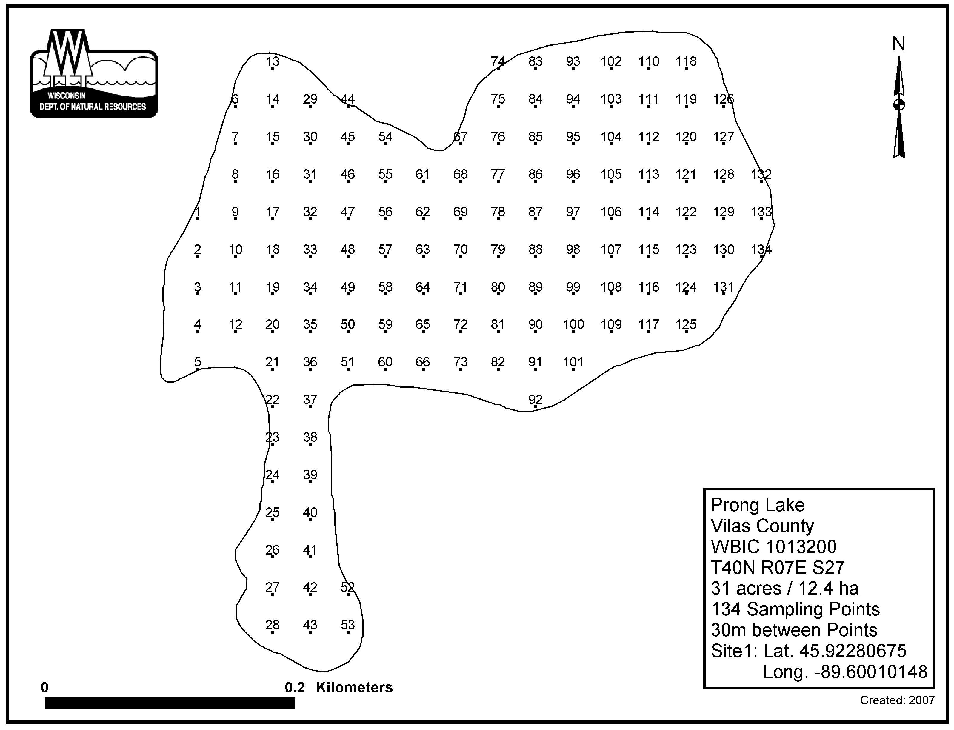 Prong Lake, Vilas County - Aquatic Plant Sampling Map (30 mpts)
