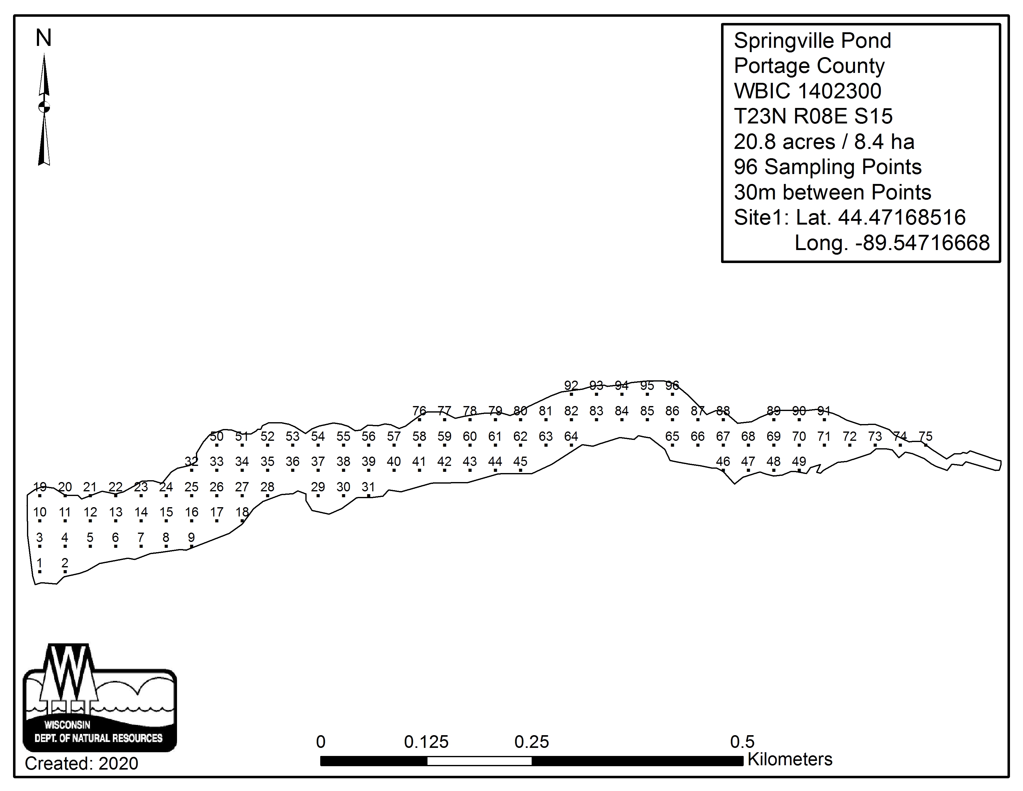 Springville Pond, Portage County - Aquatic Plant Sampling Map (30 mpts)