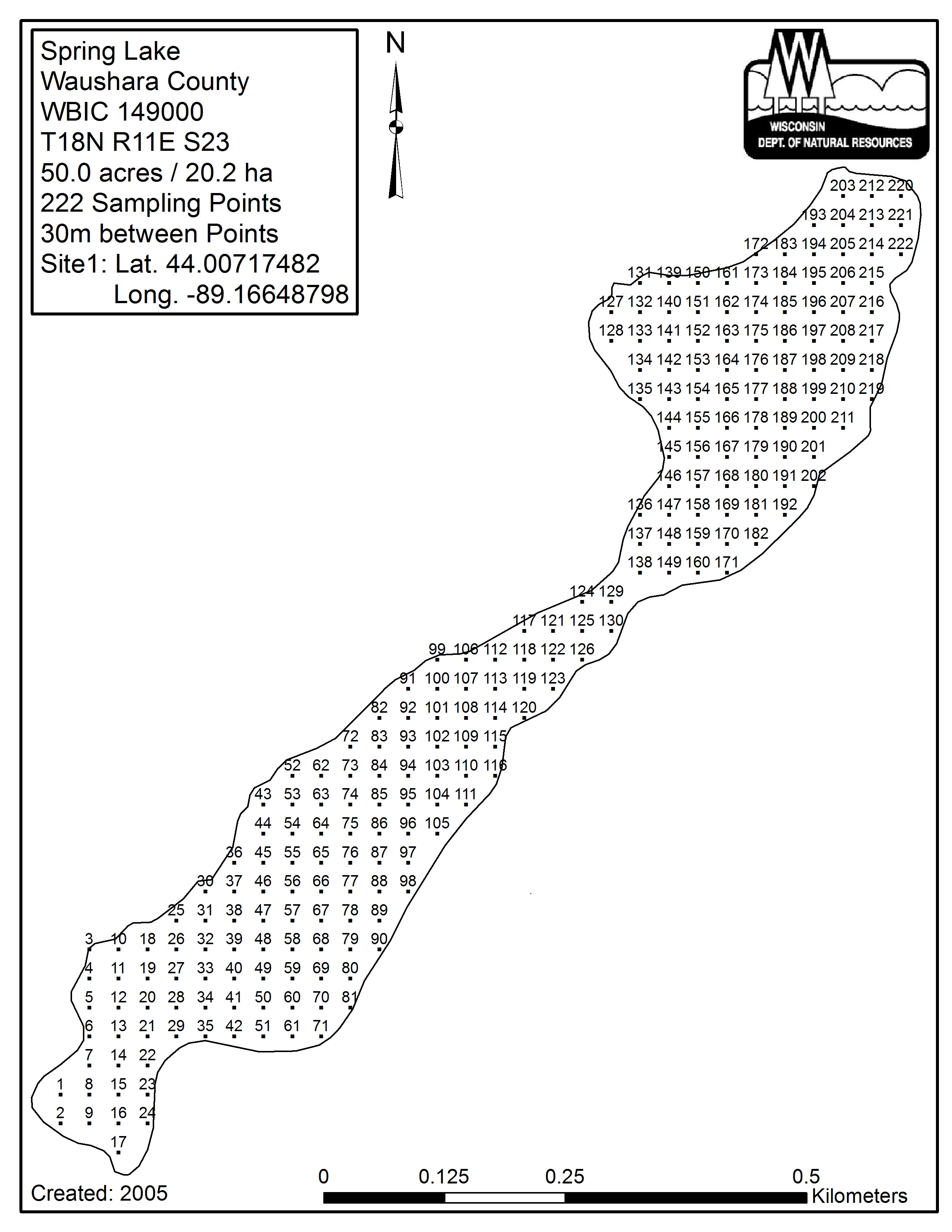 Spring Lake, Waushara County - Aquatic Plant Sampling Map (30 mpts)