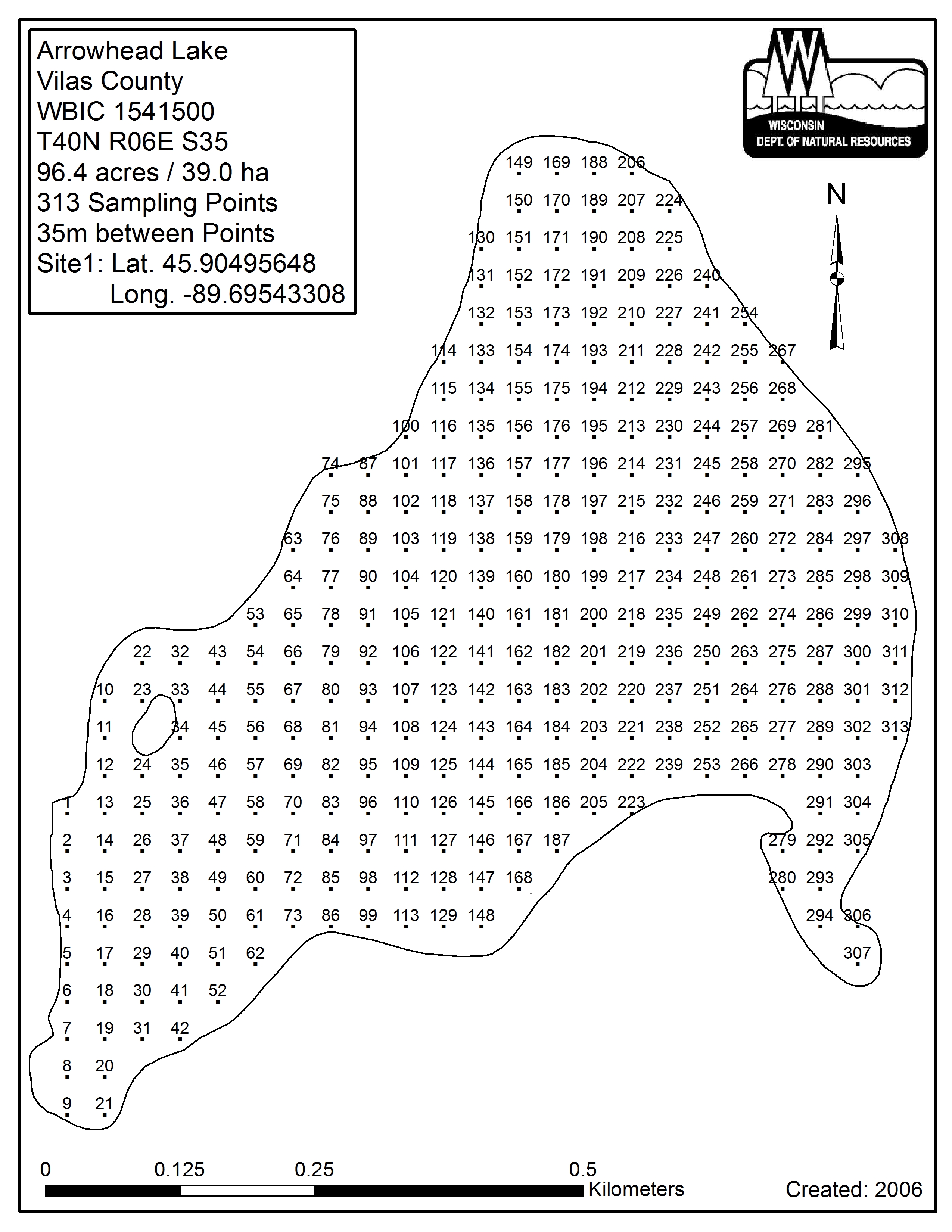 Arrowhead Lake, Vilas County - Aquatic Plant Sampling Map (35 mpts)