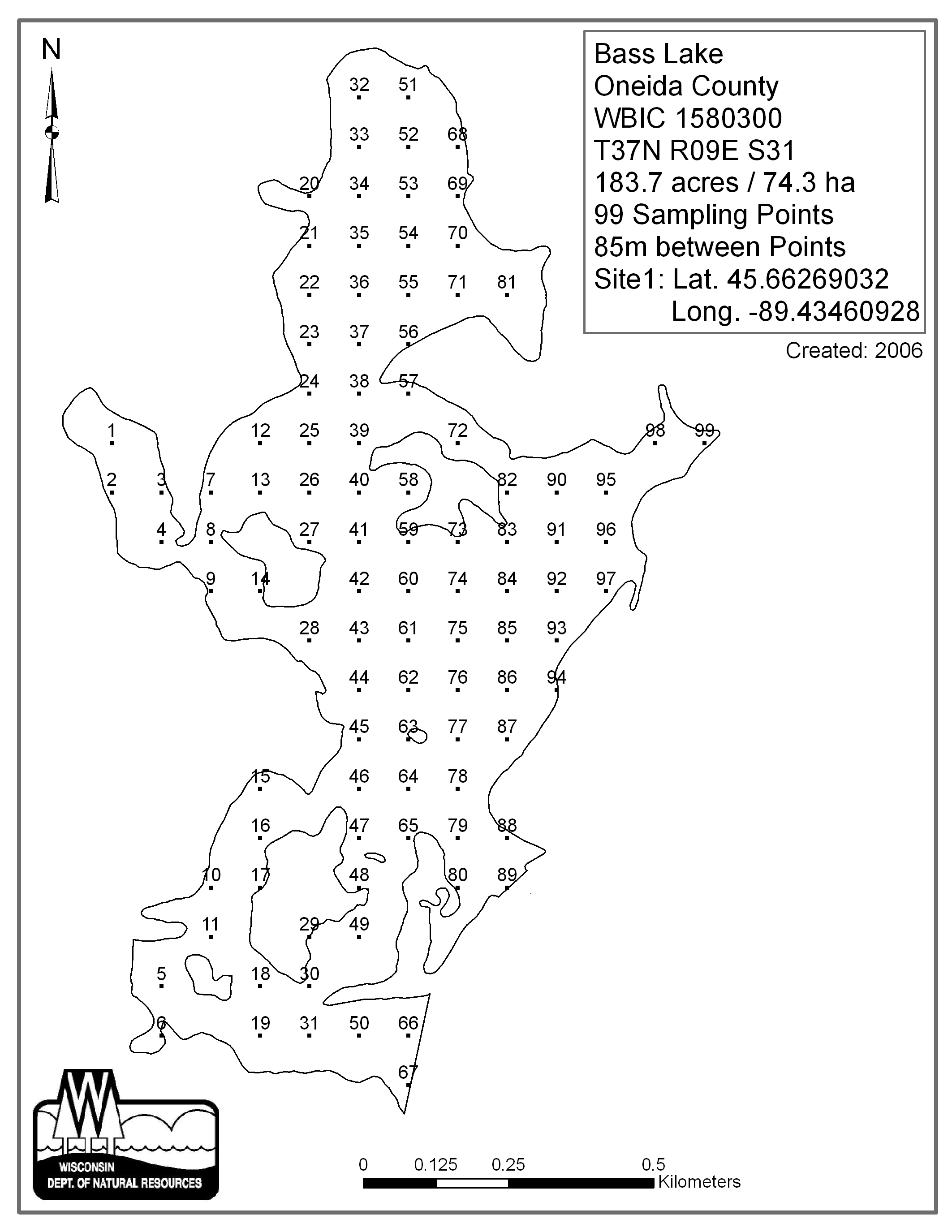 Bass Lake T37n R09e S30, Oneida County - Aquatic Plant Sampling Map (85 mpts)