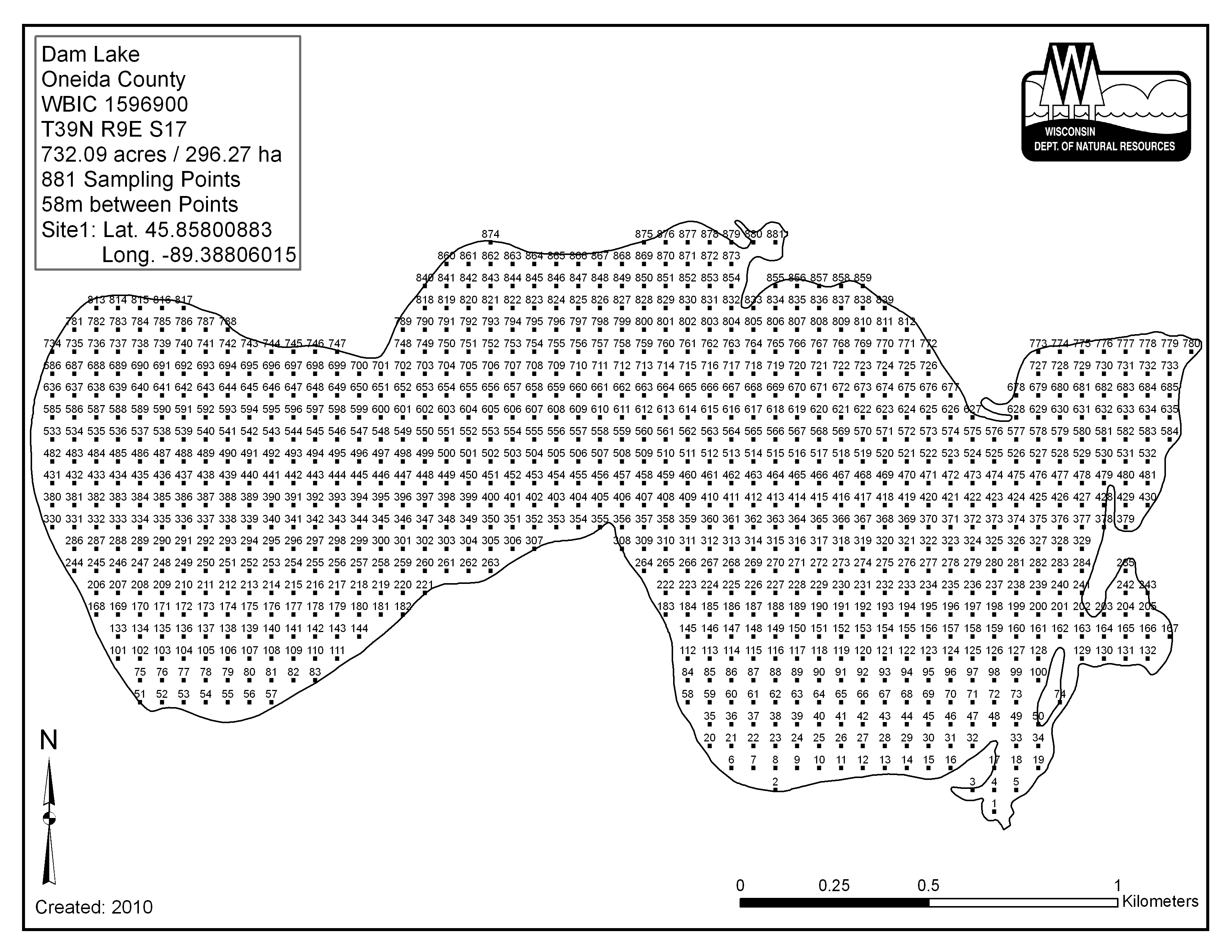 Dam Lake, Oneida County - Aquatic Plant Sampling Map (58 mpts)