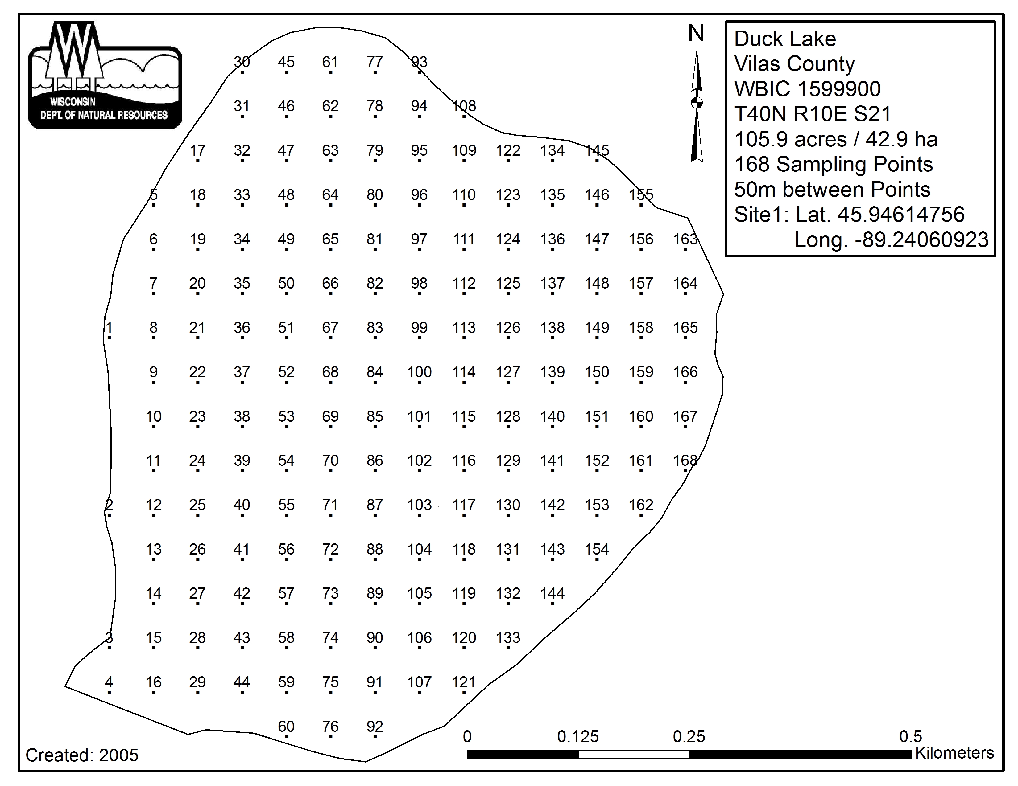 Duck Lake, Vilas County - Aquatic Plant Sampling Map (50 mpts)
