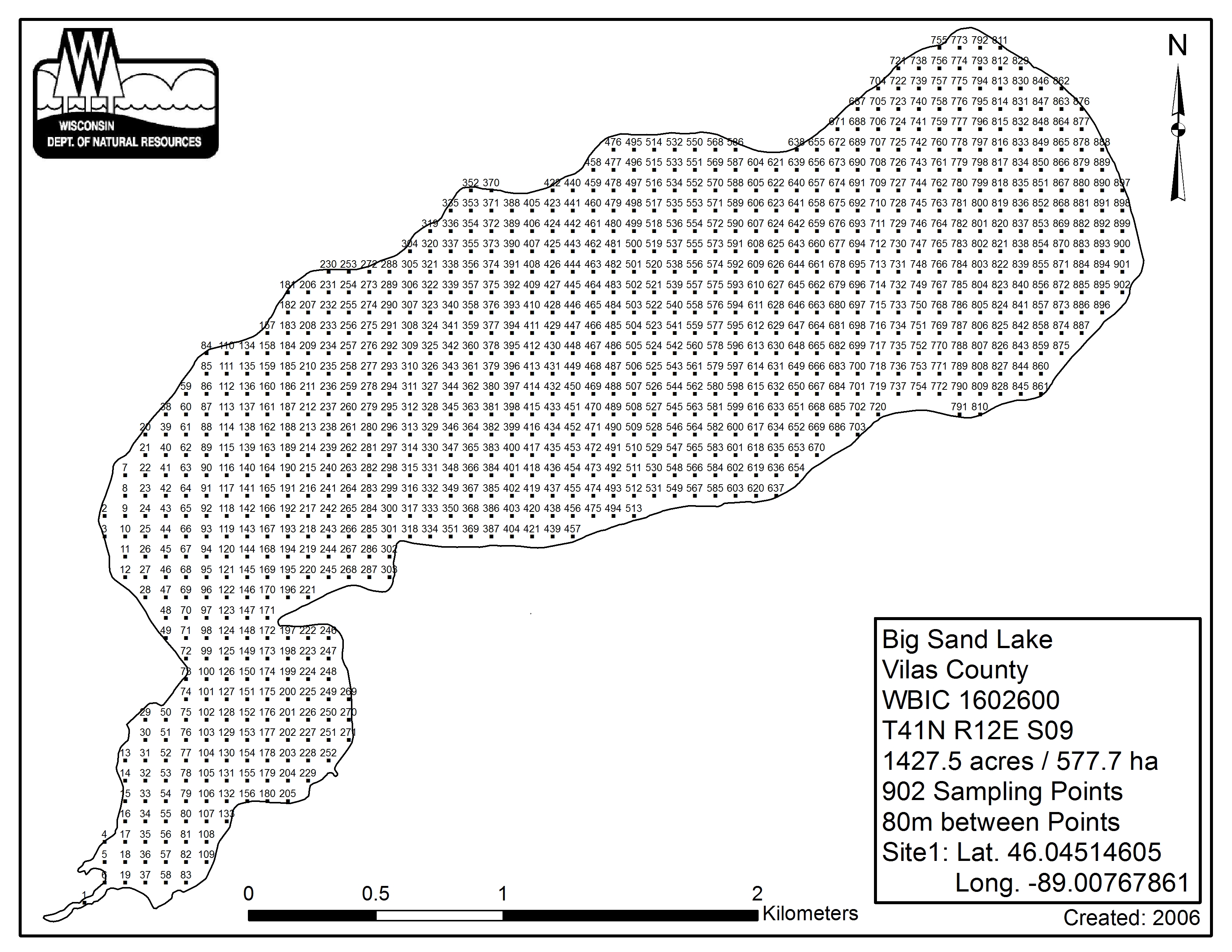 Big Sand Lake, Vilas County - Aquatic Plant Sampling Map (80 mpts)