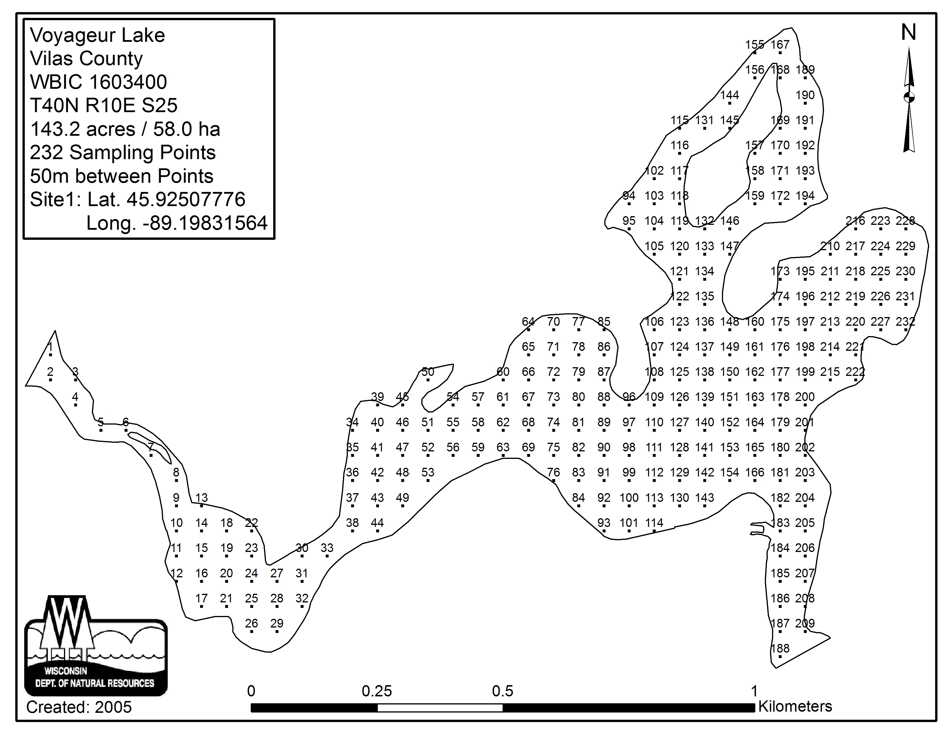 Voyageur Lake, Vilas County - Aquatic Plant Sampling Map (50 mpts)
