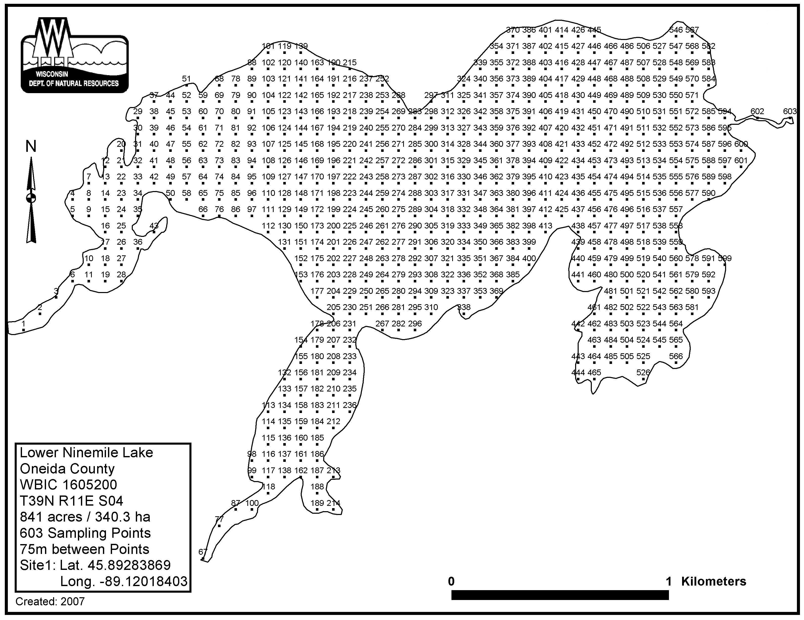 Lower Ninemile Lake, Oneida County - Aquatic Plant Sampling Map (75 mpts)