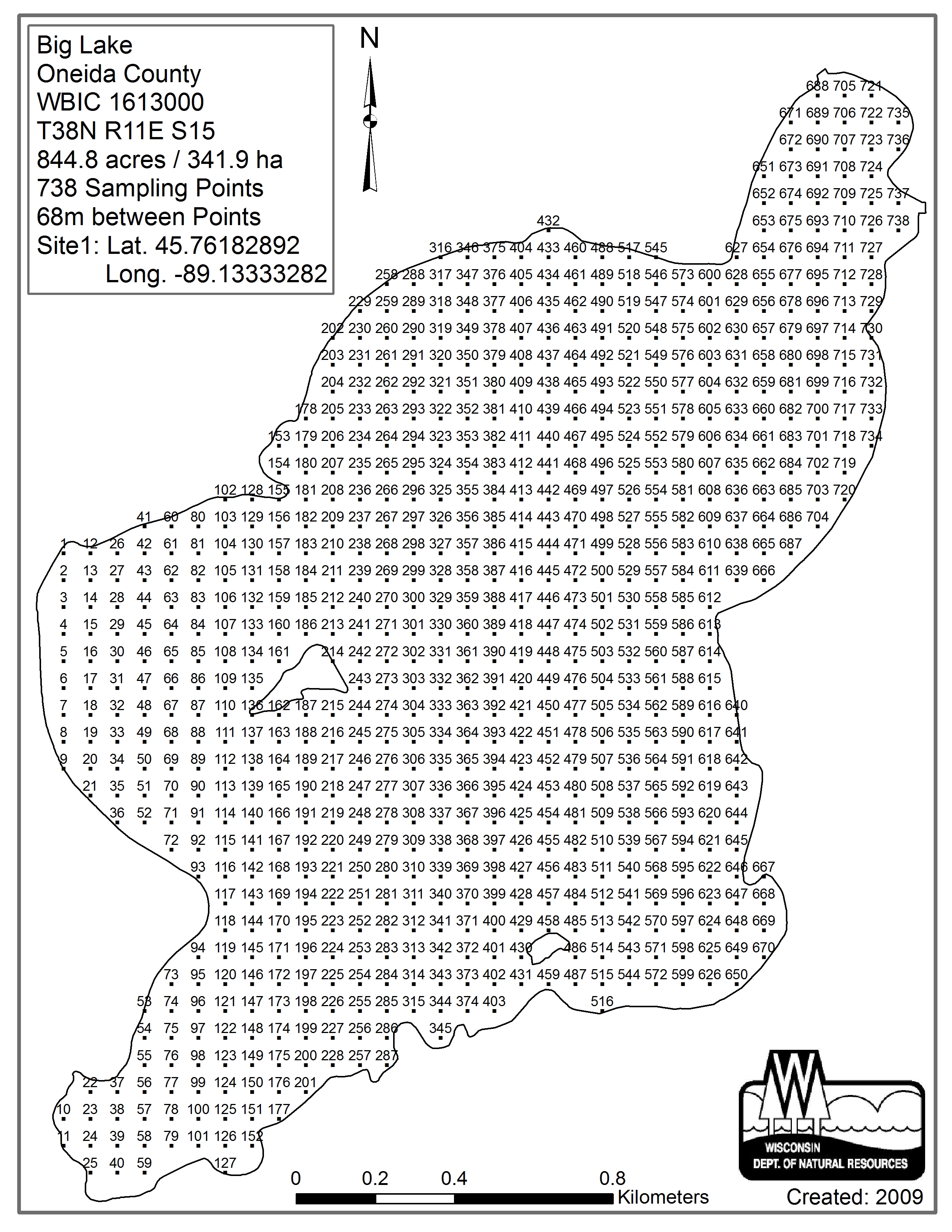 Big Lake, Oneida County - Aquatic Plant Sampling Map (68 mpts)