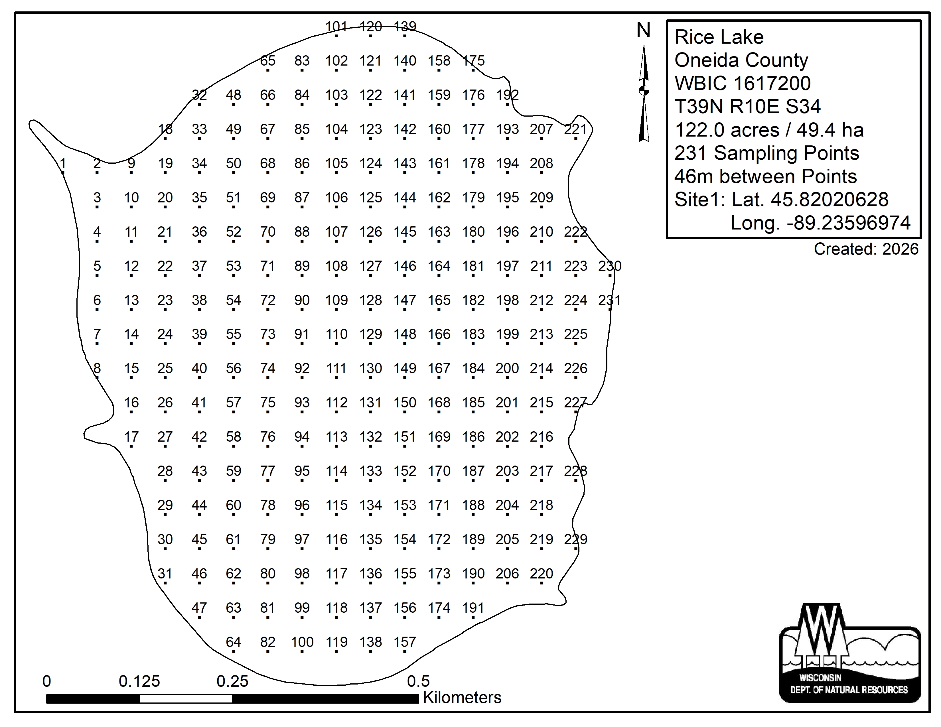 Rice Lake, Oneida County - Aquatic Plant Sampling Map (46 mpts)