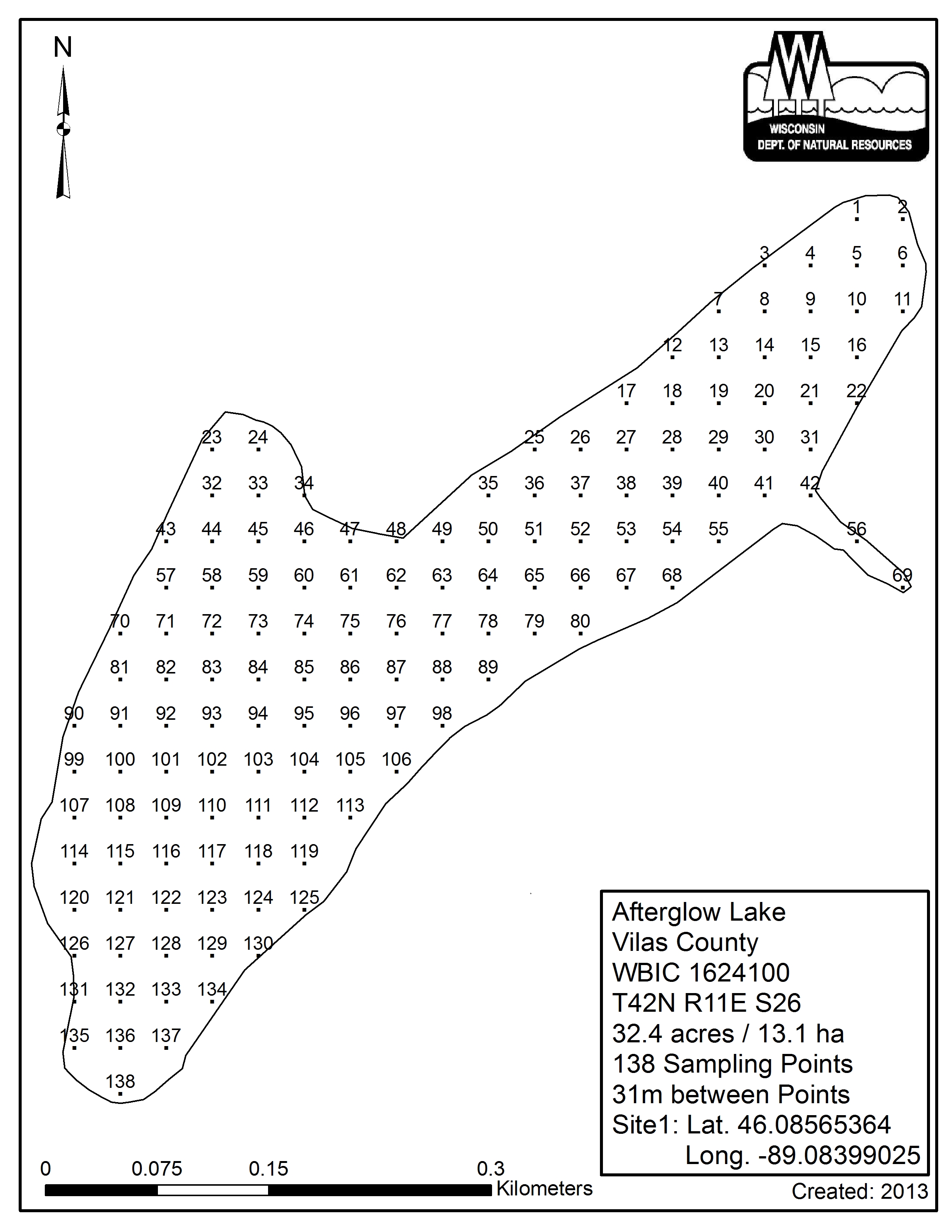 Afterglow Lake, Vilas County - Aquatic Plant Sampling Map (31 mpts)