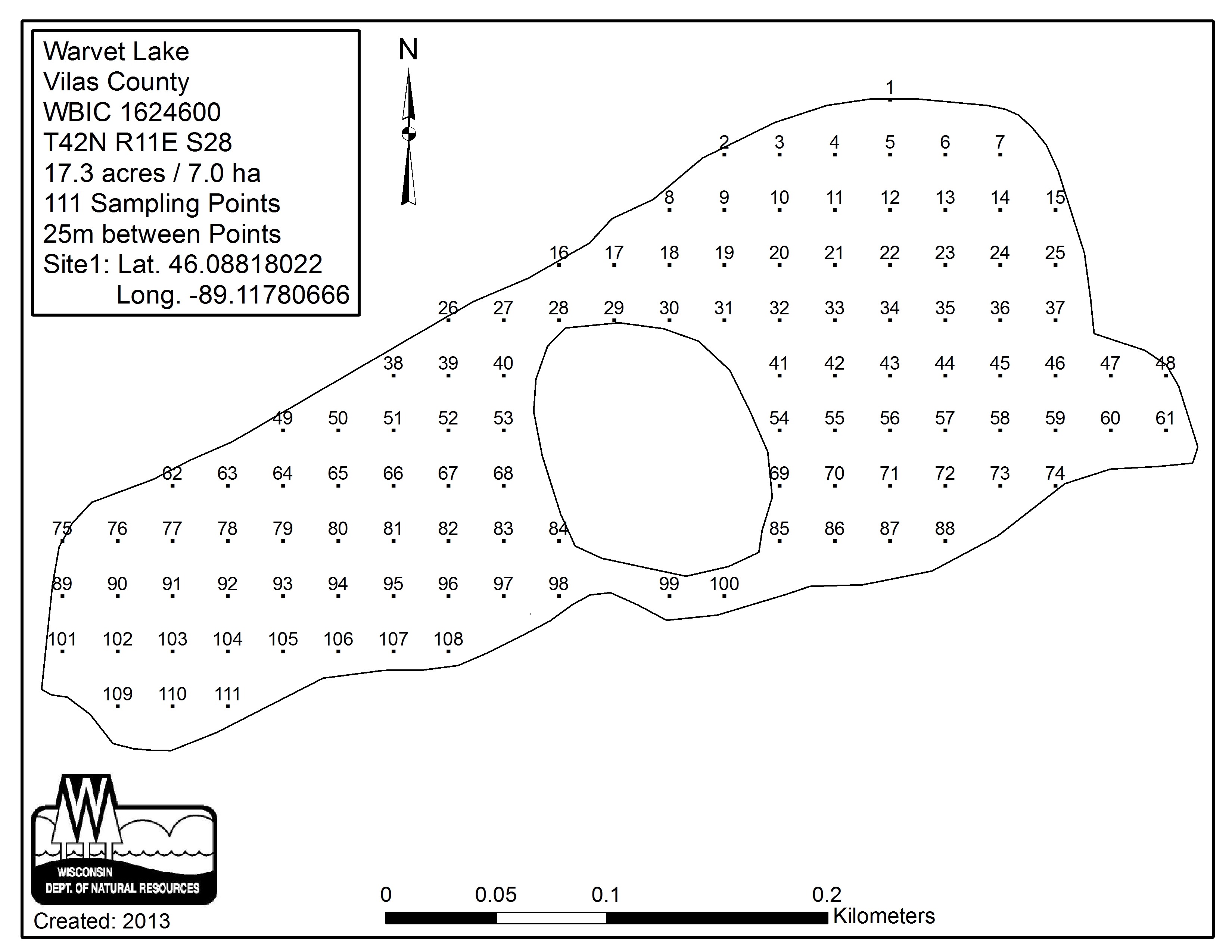 Warvet Lake, Vilas County - Aquatic Plant Sampling Map (25 mpts)