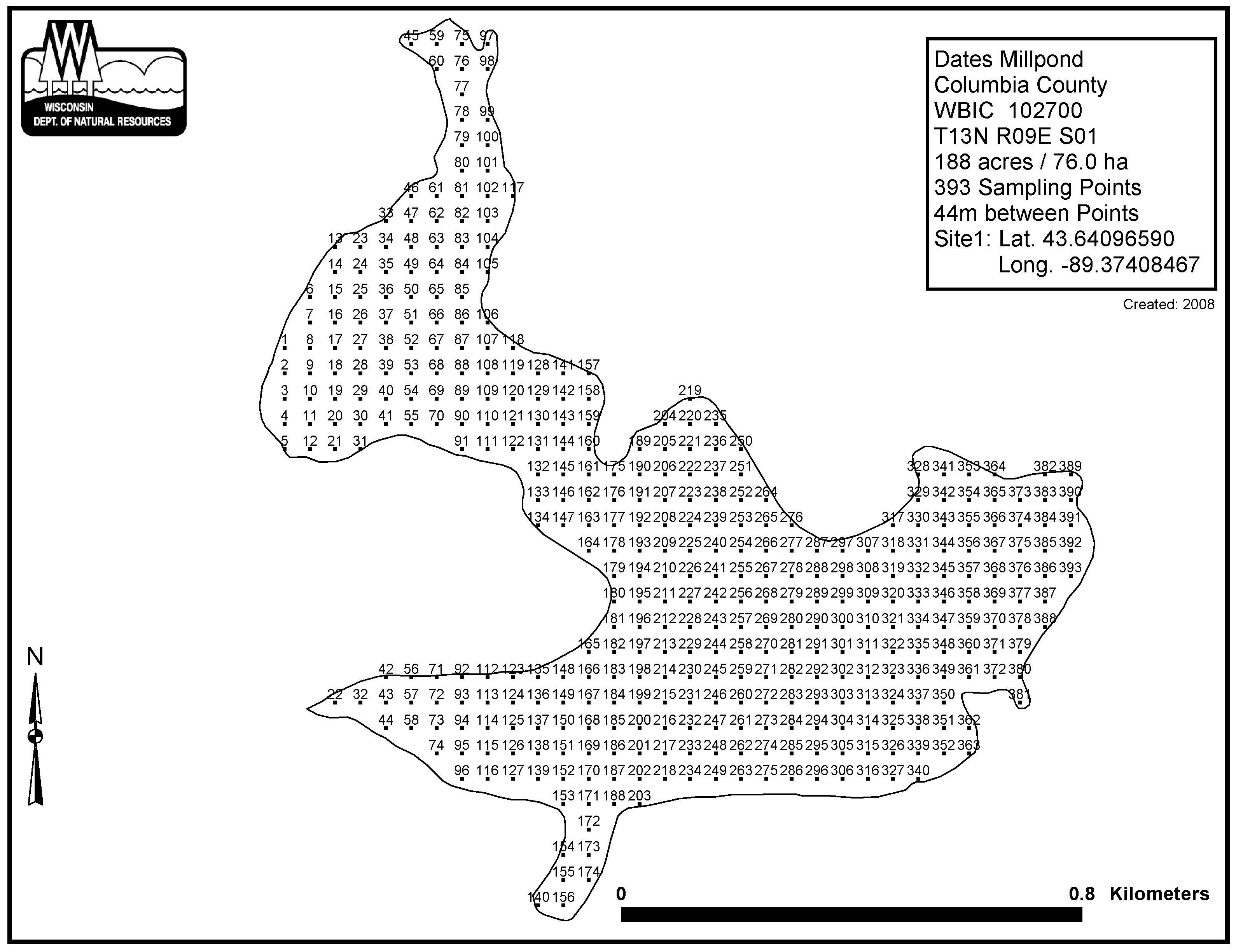 Dates Millpond, Columbia/Marquette County - Aquatic Plant Sampling Map (44 mpts)