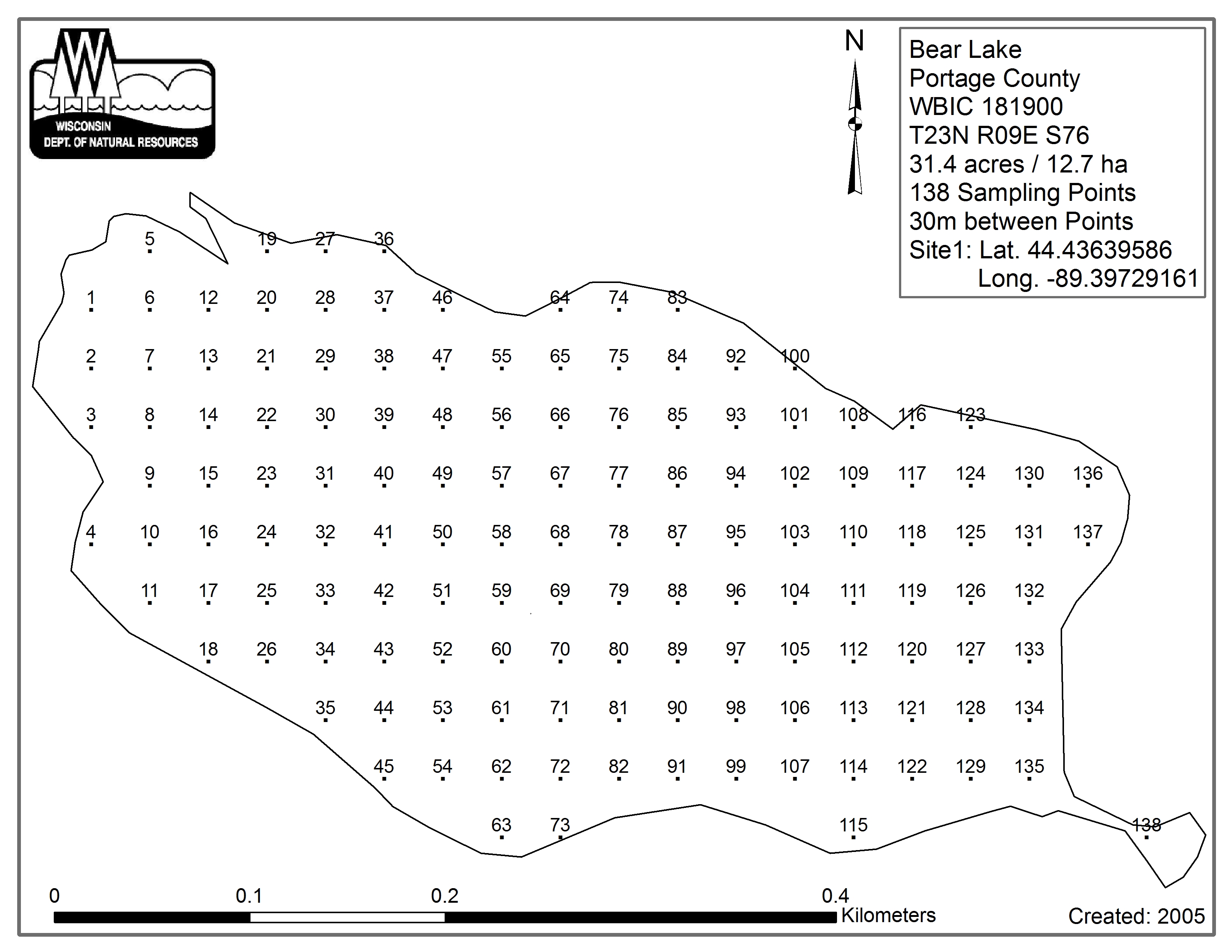 Bear Lake, Portage County - Aquatic Plant Sampling Map (30 mpts)
