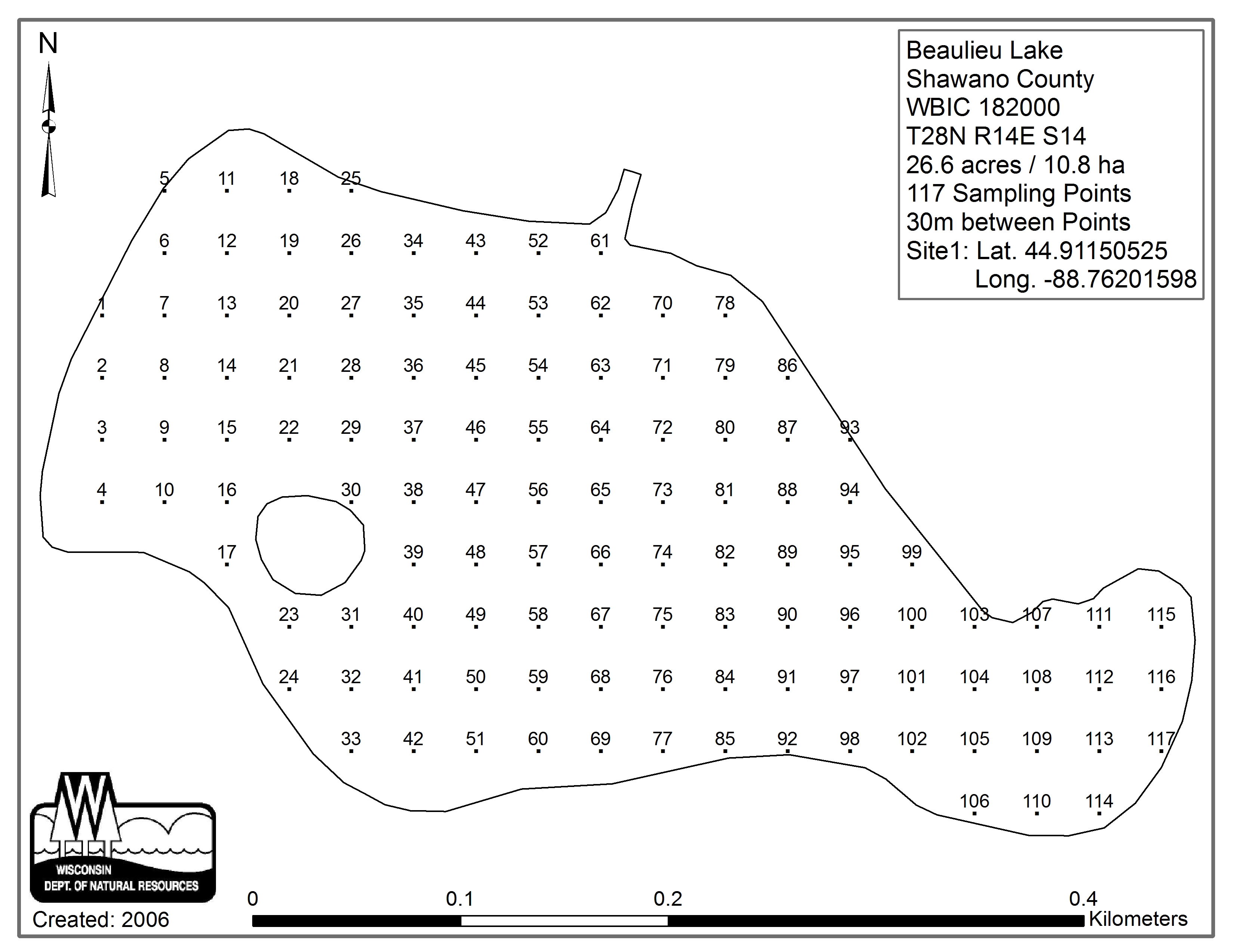 Beaulieu Lake, Shawano County - Aquatic Plant Sampling Map (30 mpts)