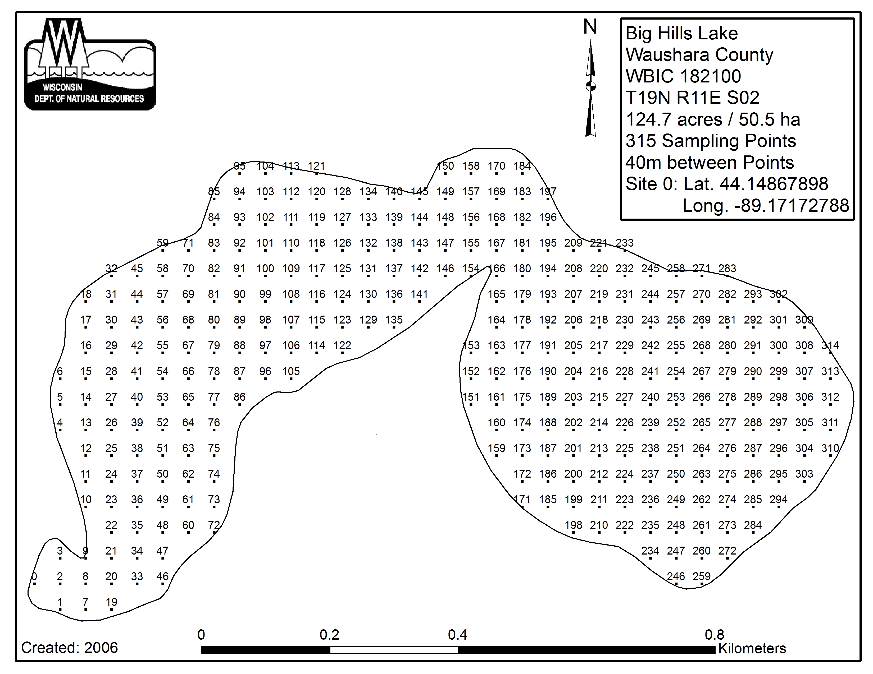 Big Hills Lake, Waushara County - Aquatic Plant Sampling Map (40 mpts)