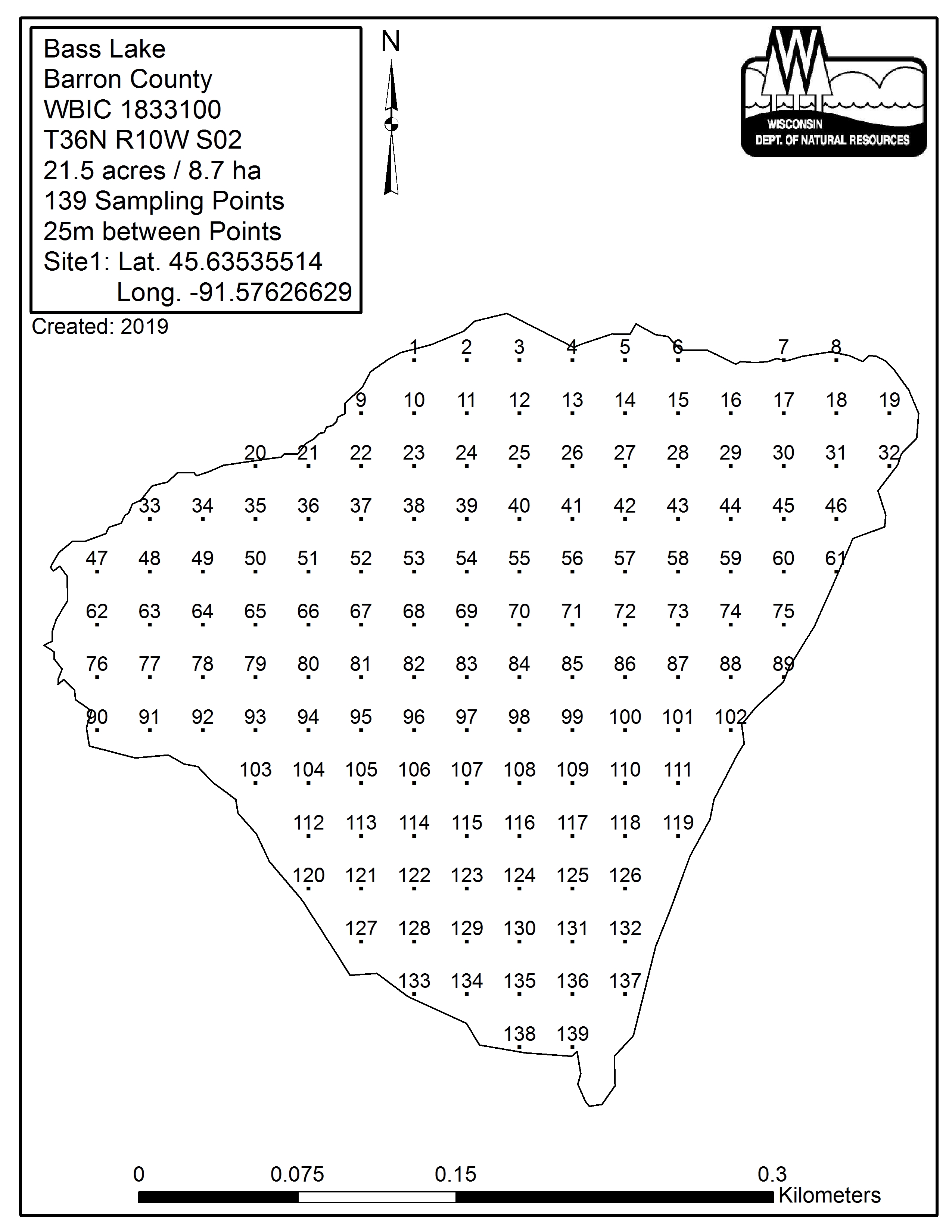 Bass Lake, Barron County - Aquatic Plant Sampling Map (25 mpts)