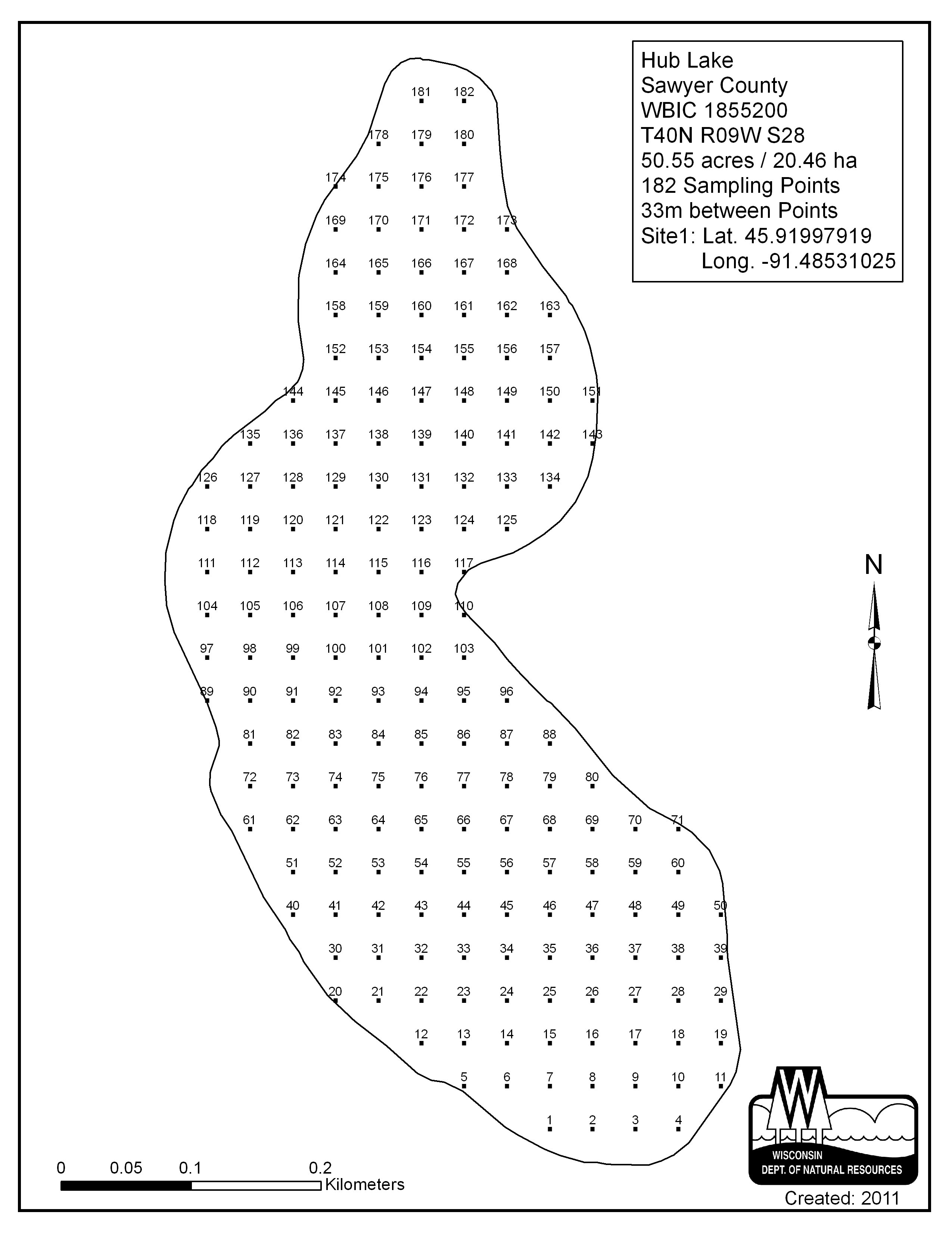 Hub Lake, Sawyer County - Aquatic Plant Sampling Map (33 mpts)