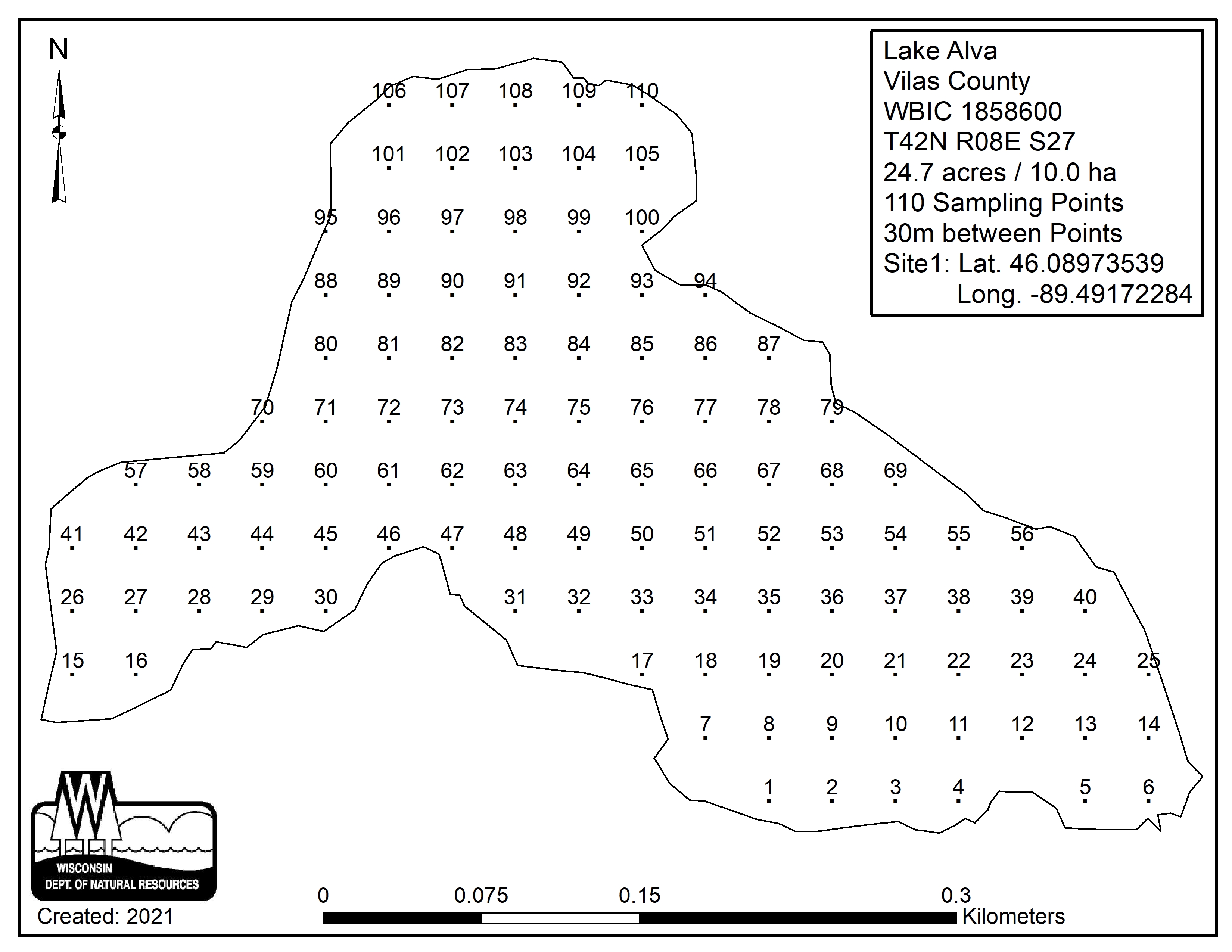 Lake Alva, Vilas County - Aquatic Plant Sampling Map (30 mpts)