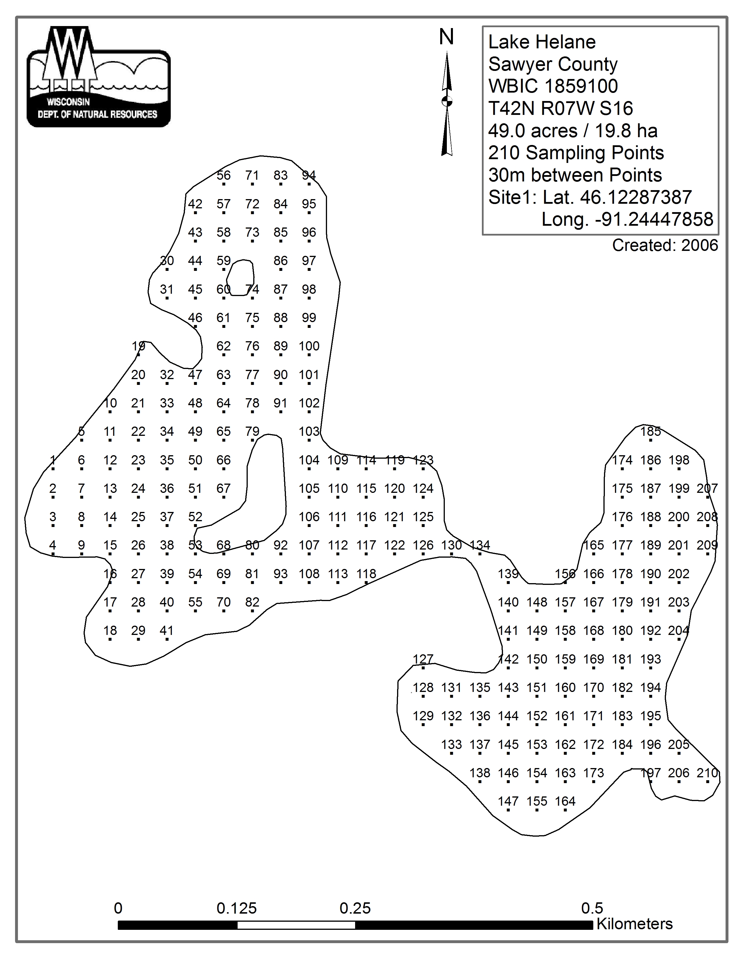 Lake Helane, Sawyer County - Aquatic Plant Sampling Map (30 mpts)
