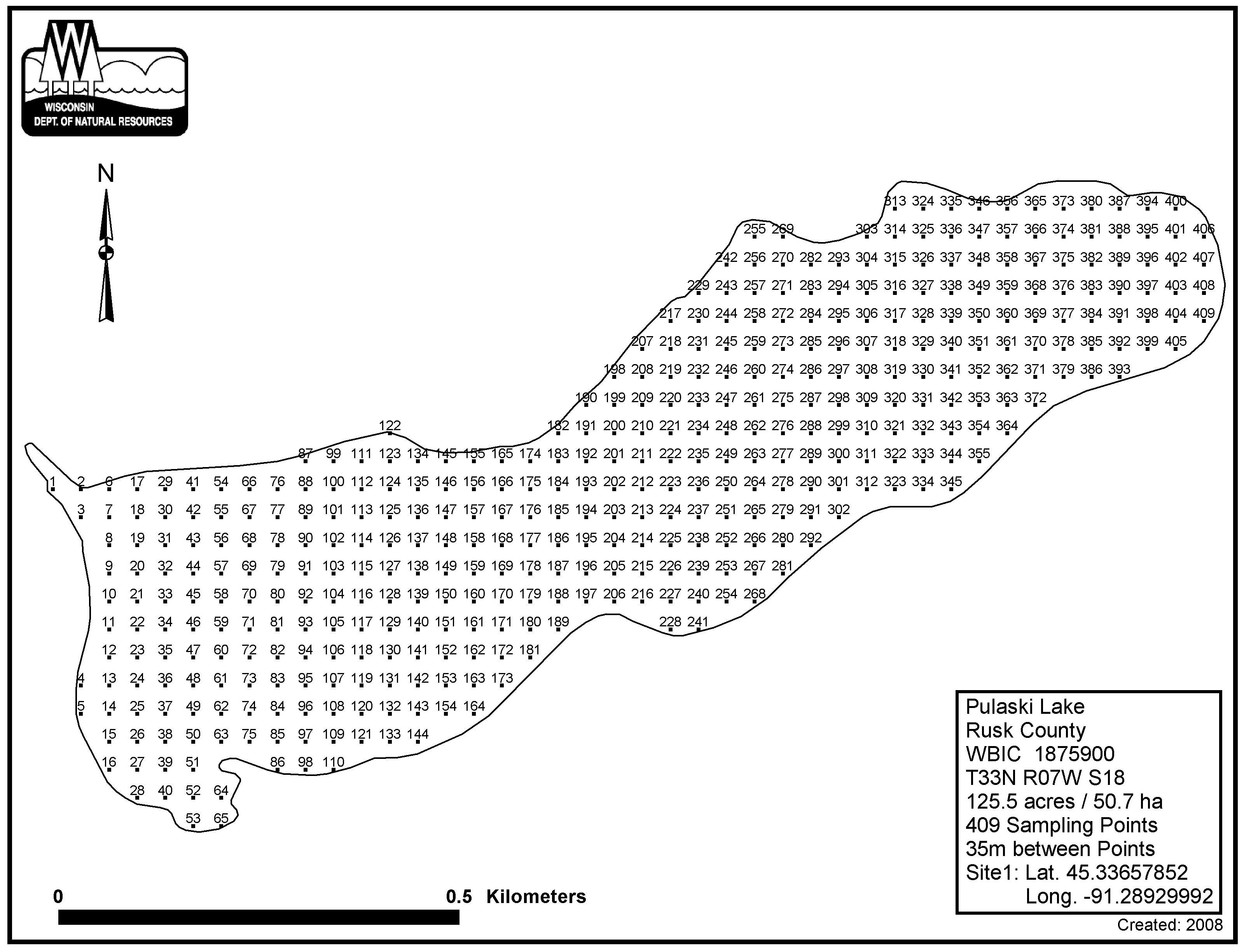 Pulaski Lake, Rusk County - Aquatic Plant Sampling Map (35 mpts)