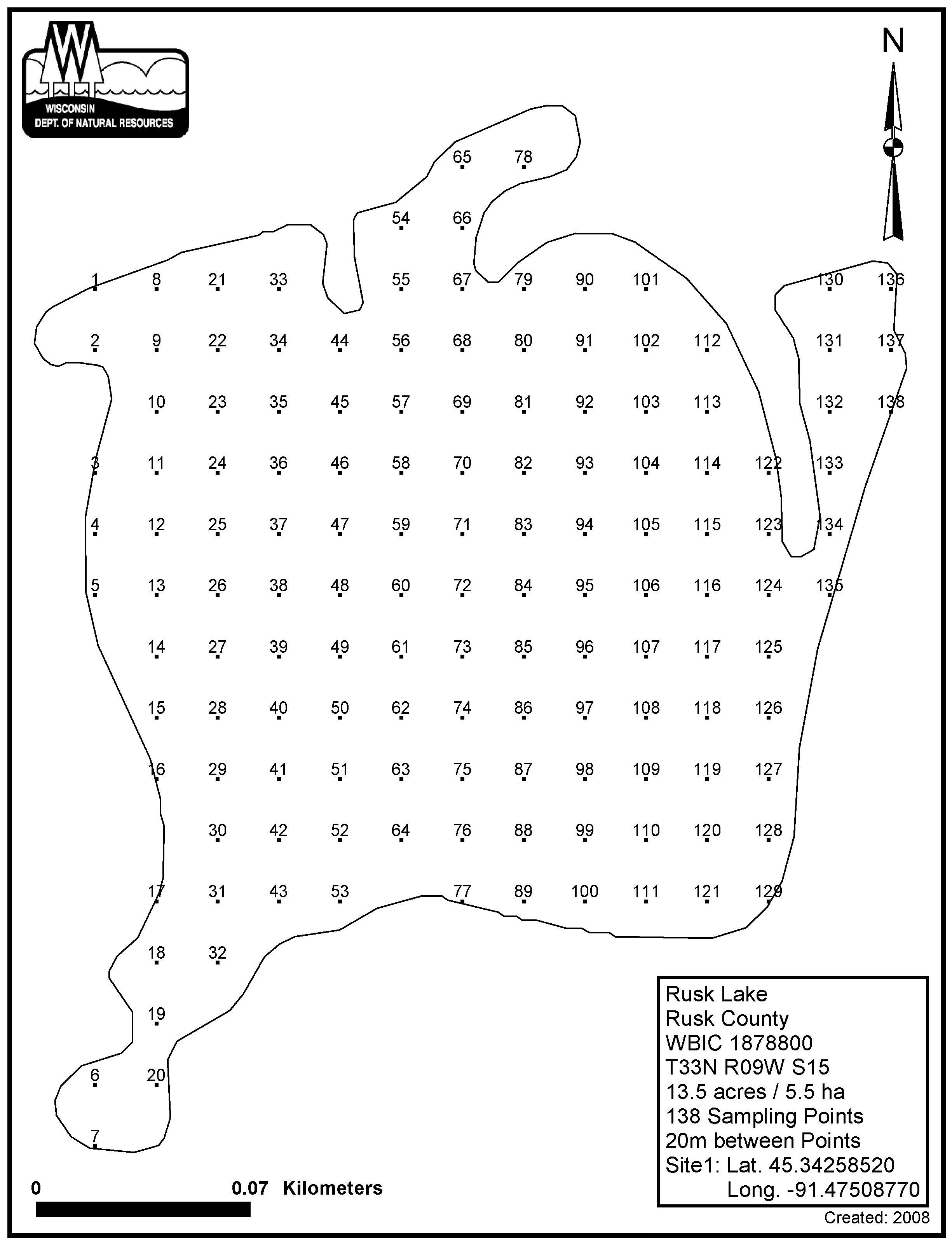 Rusk Lake, Rusk County - Aquatic Plant Sampling Map (20 mpts)
