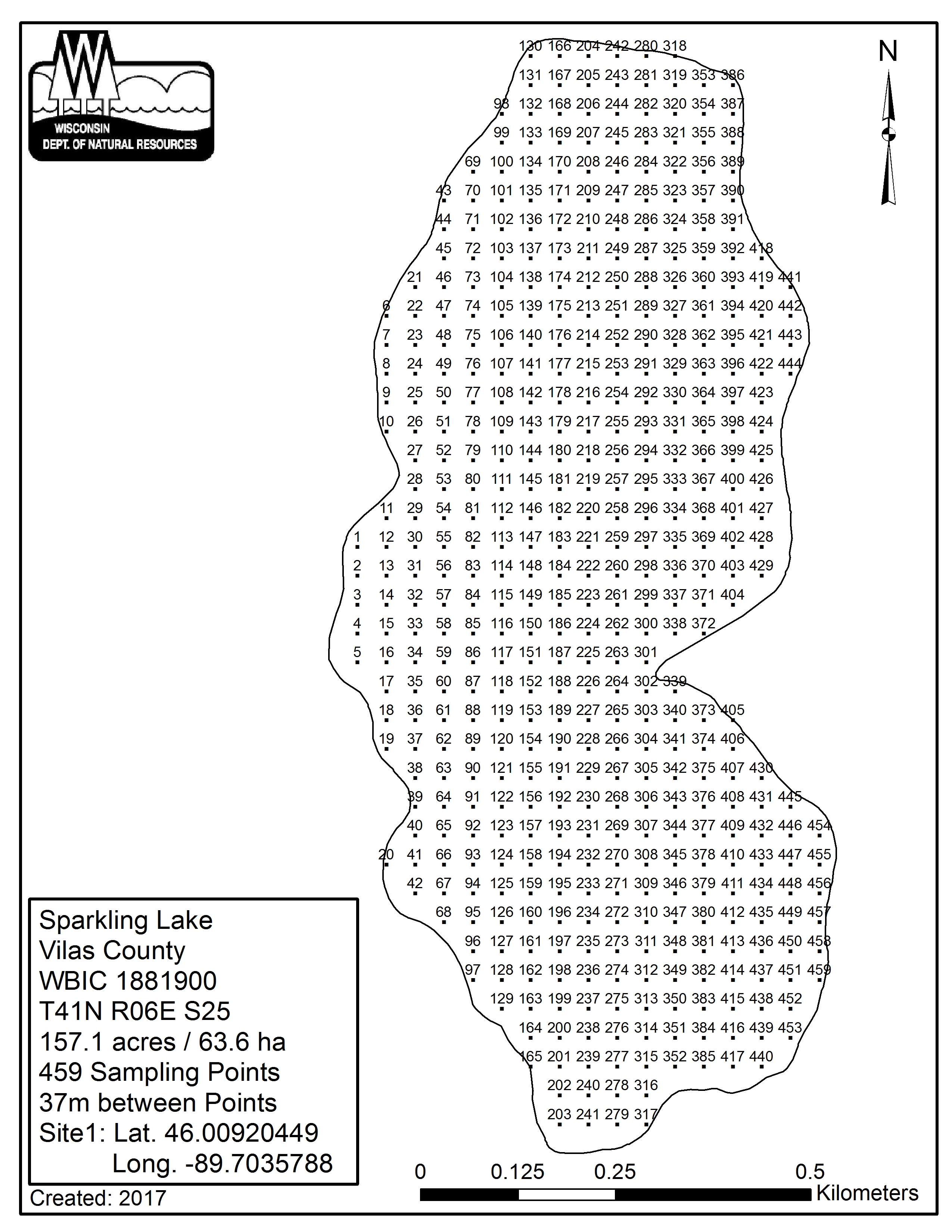 Sparkling Lake, Vilas County - Aquatic Plant Sampling Map (37 mpts)