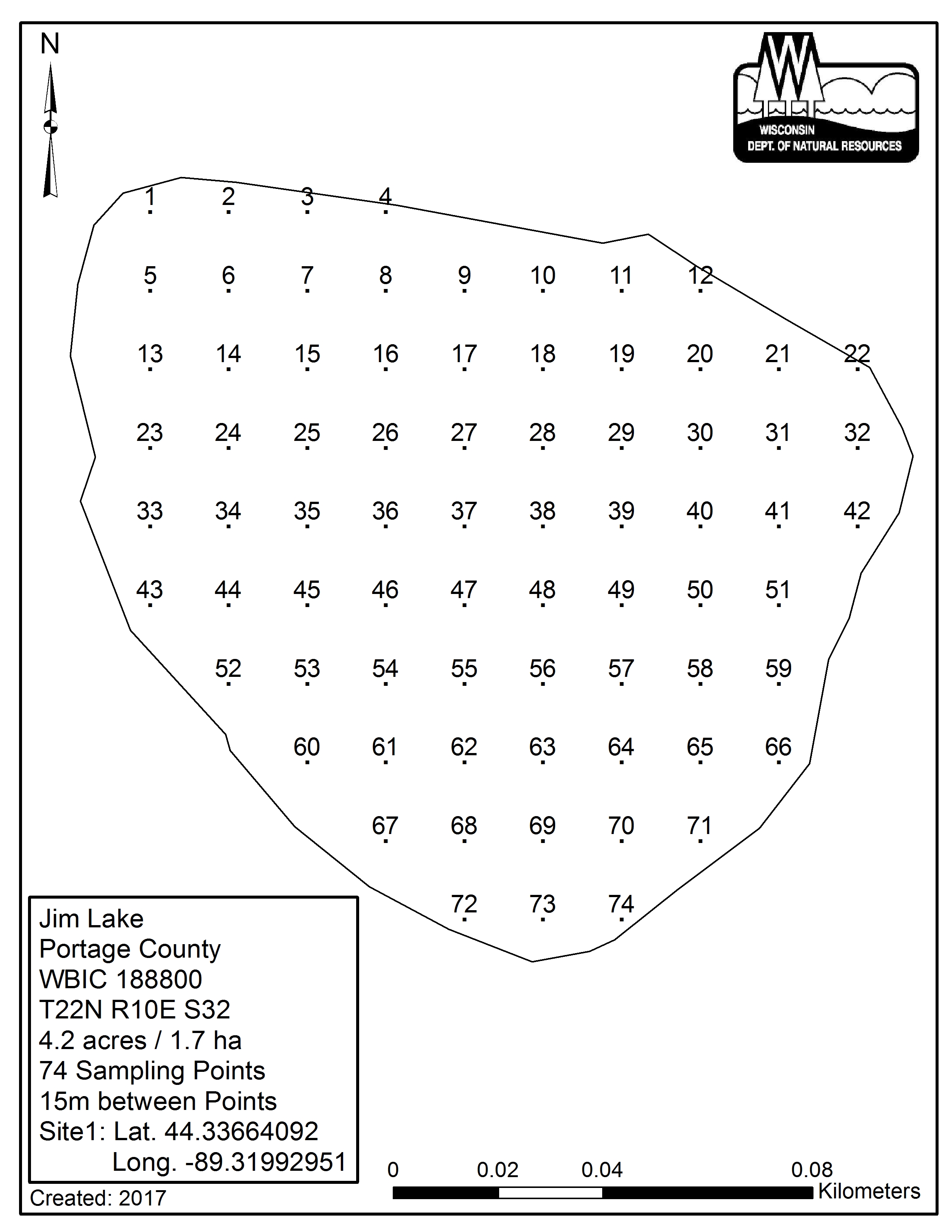 Jim Lake, Portage County - Aquatic Plant Sampling Map (15 mpts)