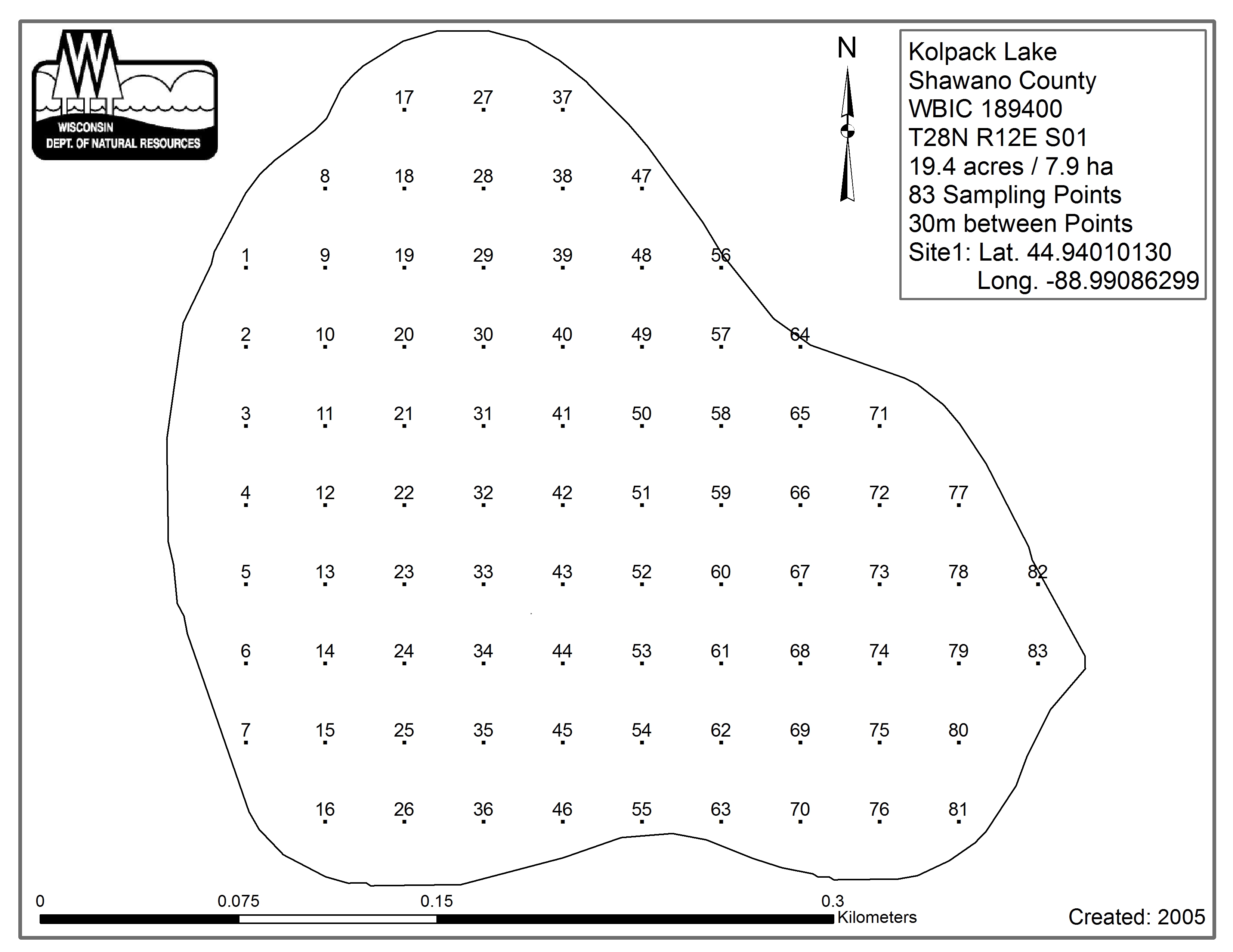 Kolpack Lake, Shawano County - Aquatic Plant Sampling Map (30 mpts)