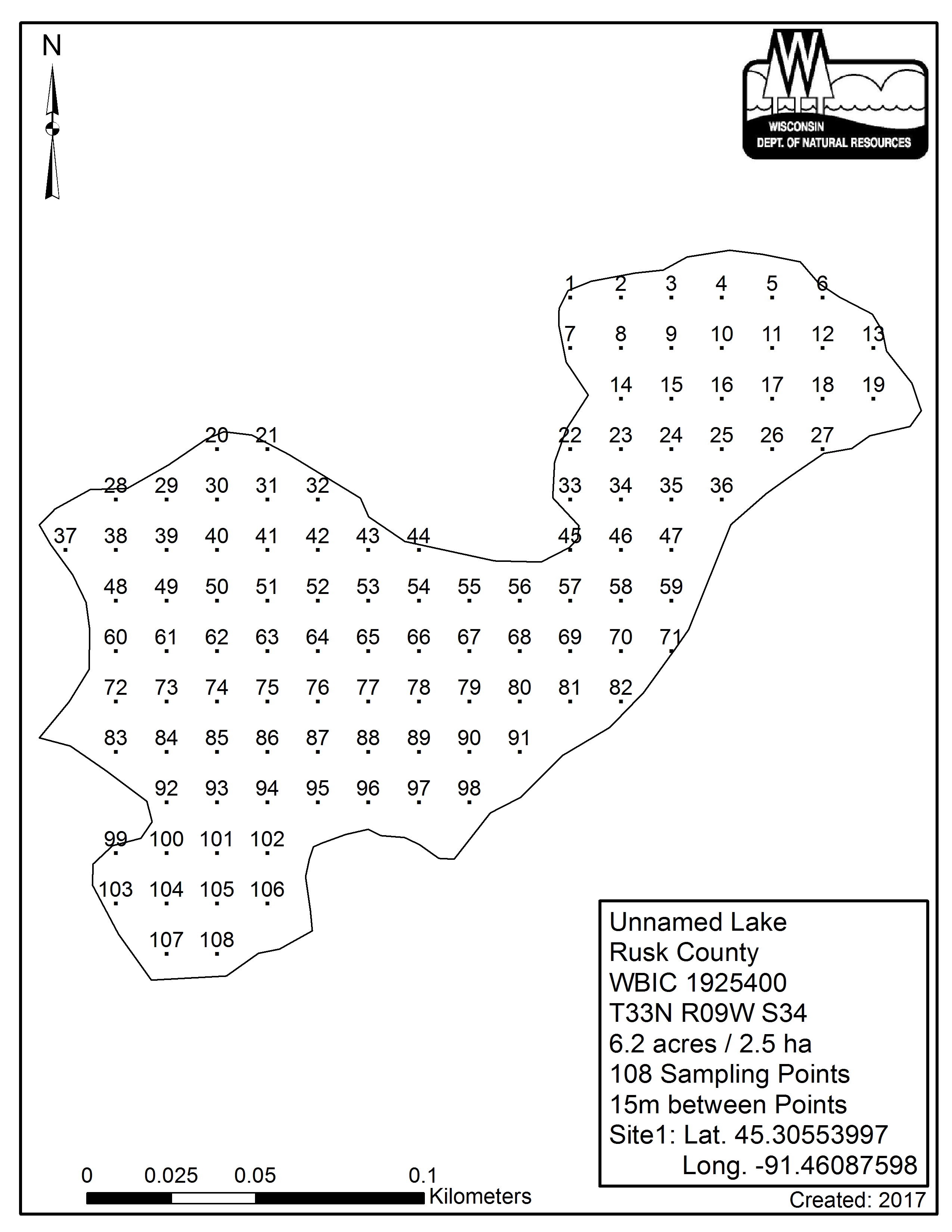 Unnamed Lake, Rusk County (1925400) - Aquatic Plant Sampling Map (15 mpts)