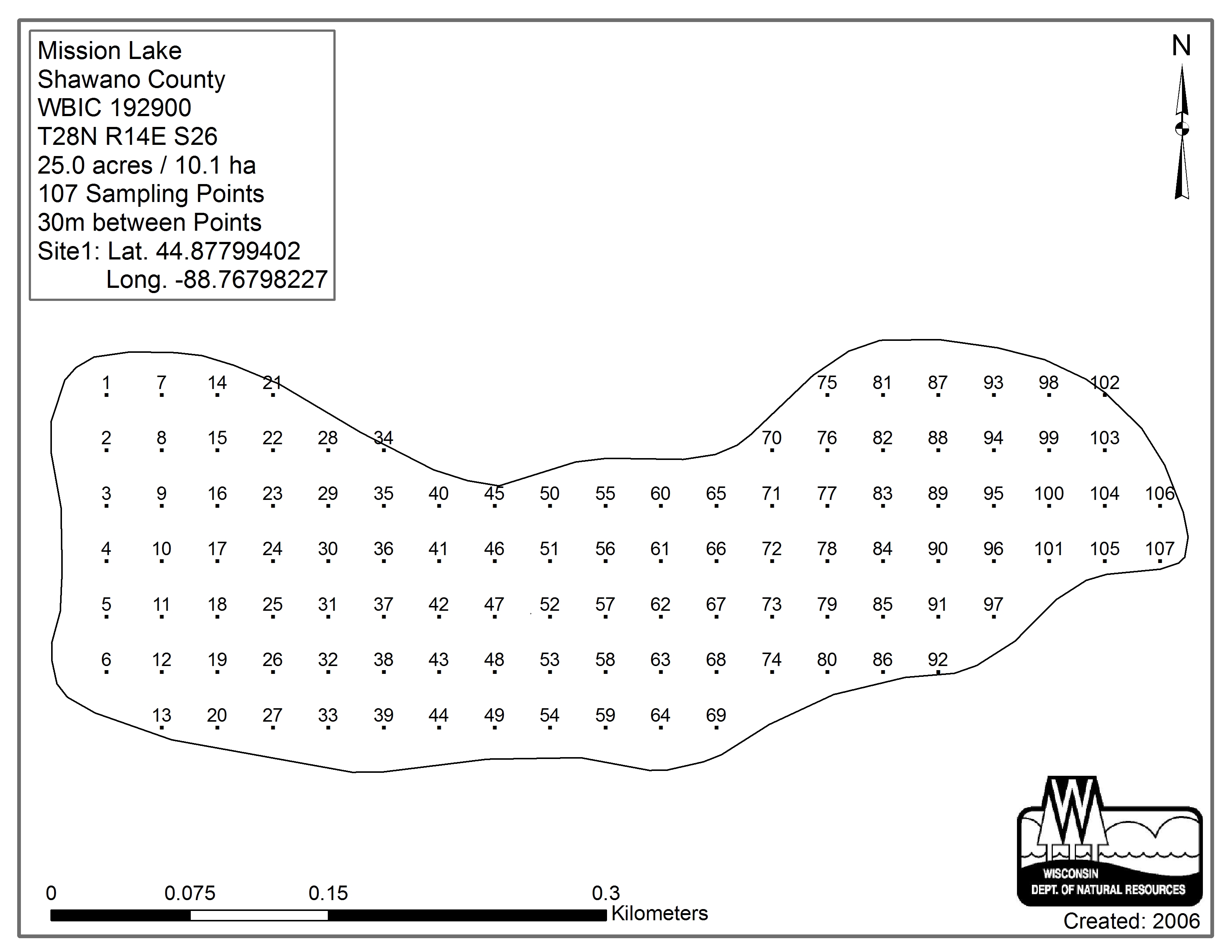 Mission Lake, Shawano County - Aquatic Plant Sampling Map (30 mpts)