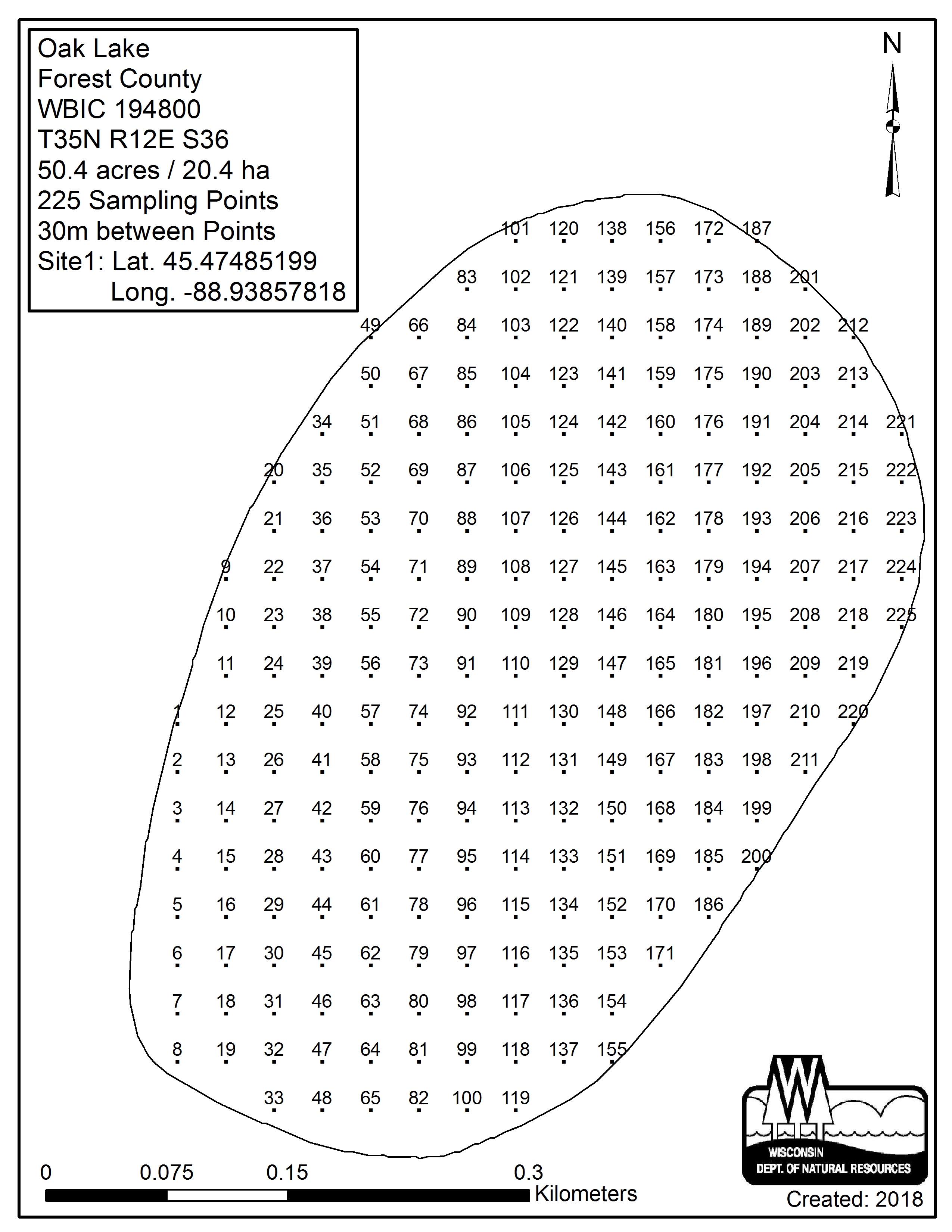 Oak Lake, Forest County - Aquatic Plant Sampling Map (30 mpts)