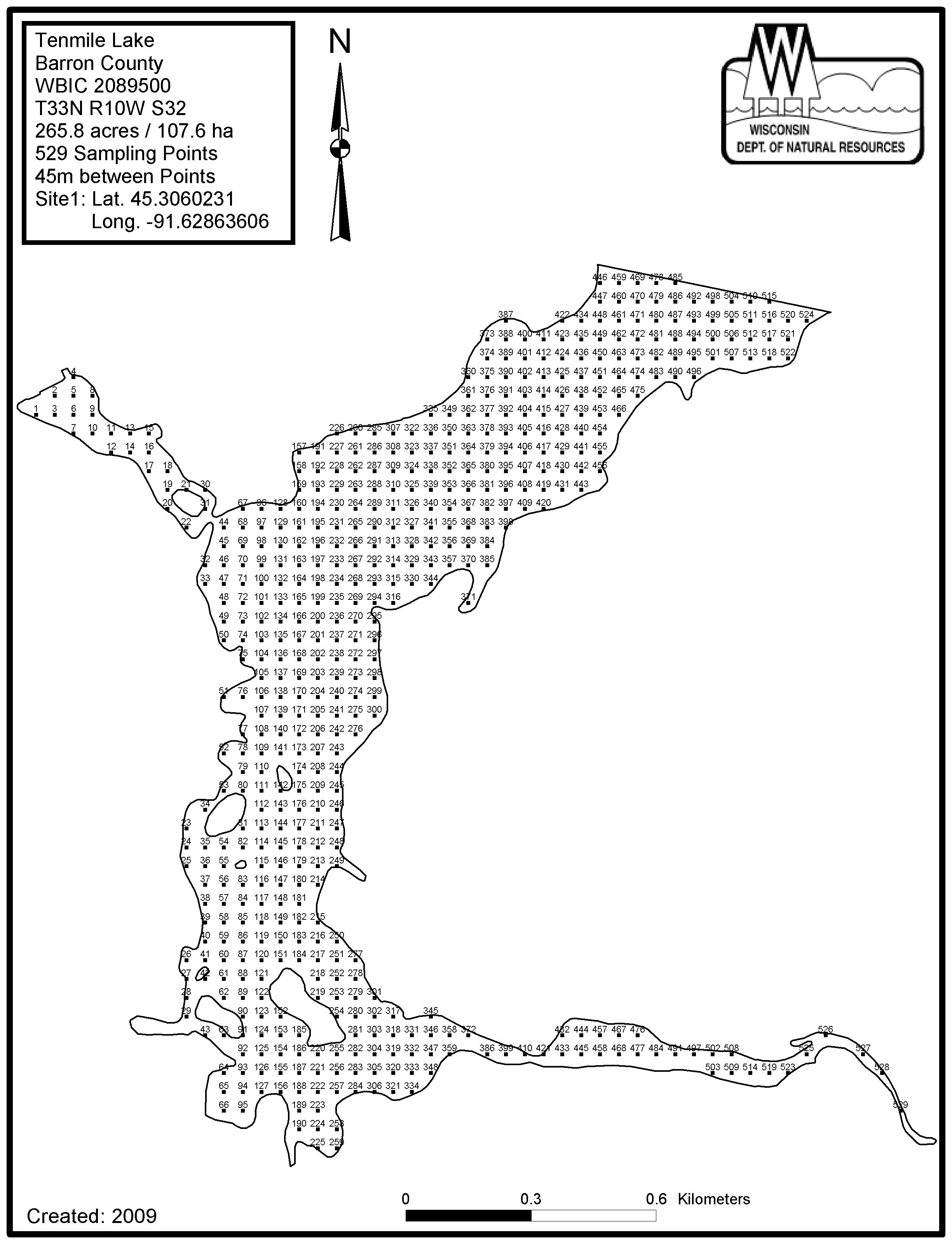 Tenmile Lake, Barron County - Aquatic Plant Sampling Map (45 mpts)