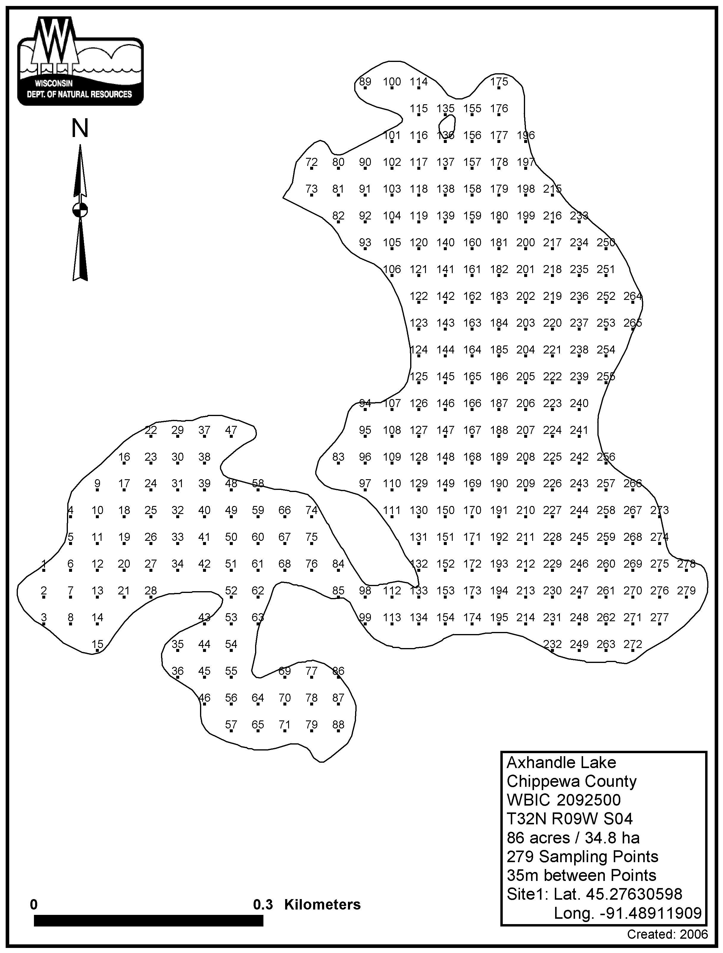Axhandle Lake, Chippewa County - Aquatic Plant Sampling Map (35 mpts)