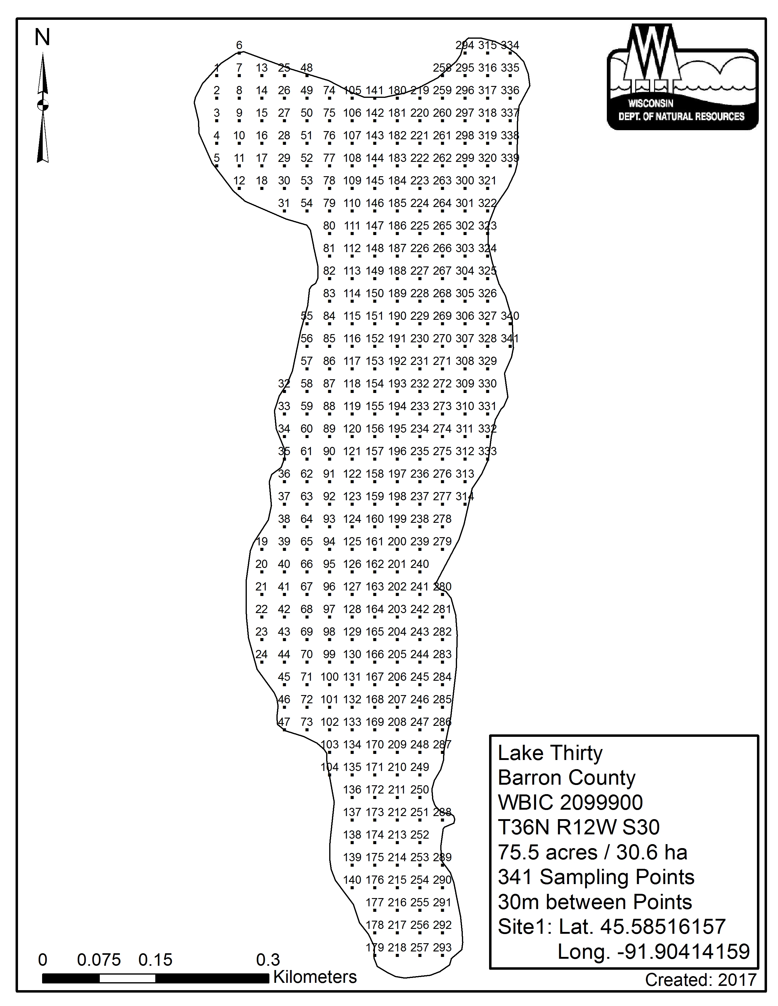 Lake Thirty, Barron County - Aquatic Plant Sampling Map (30 mpts)
