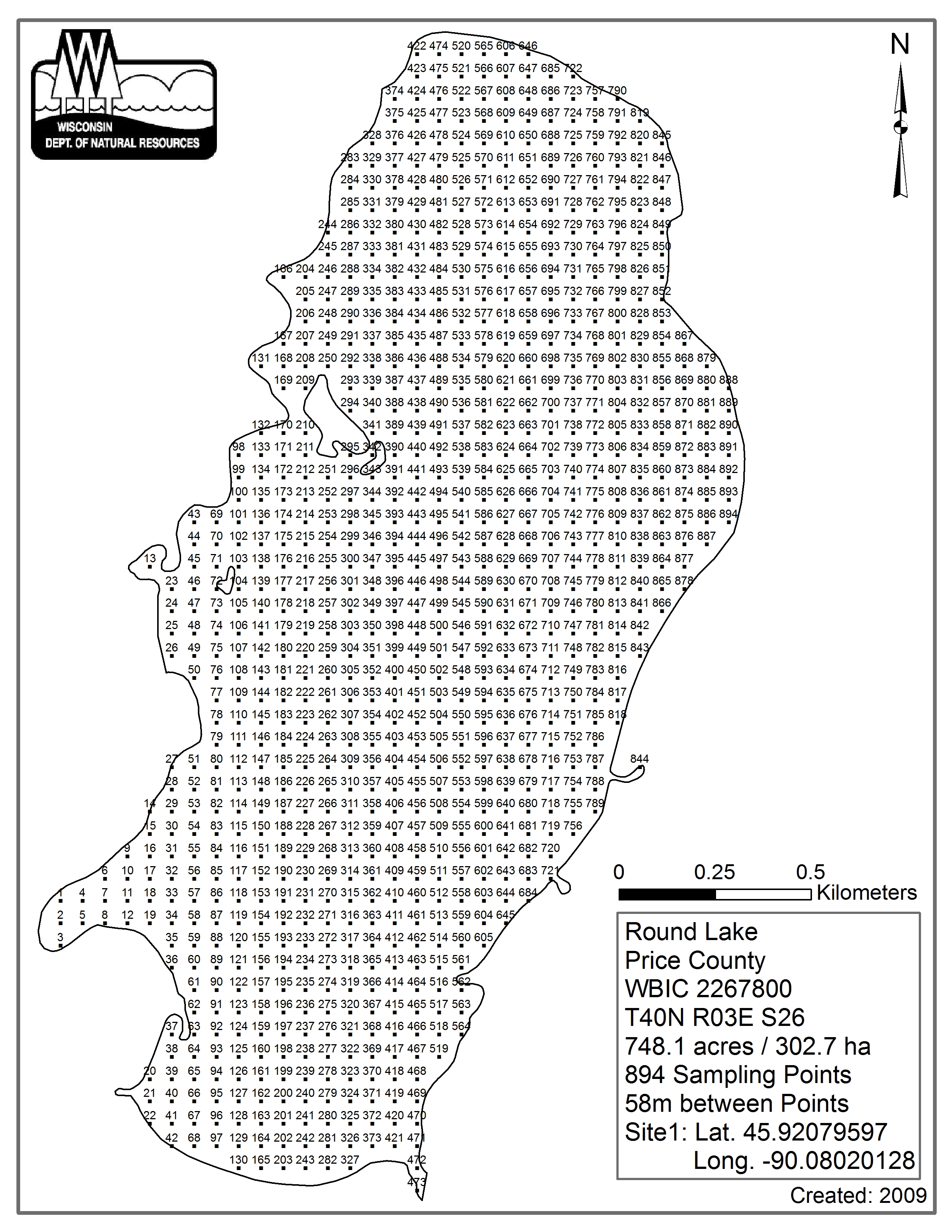 Round Lake, Price County - Aquatic Plant Sampling Map (58 mpts)