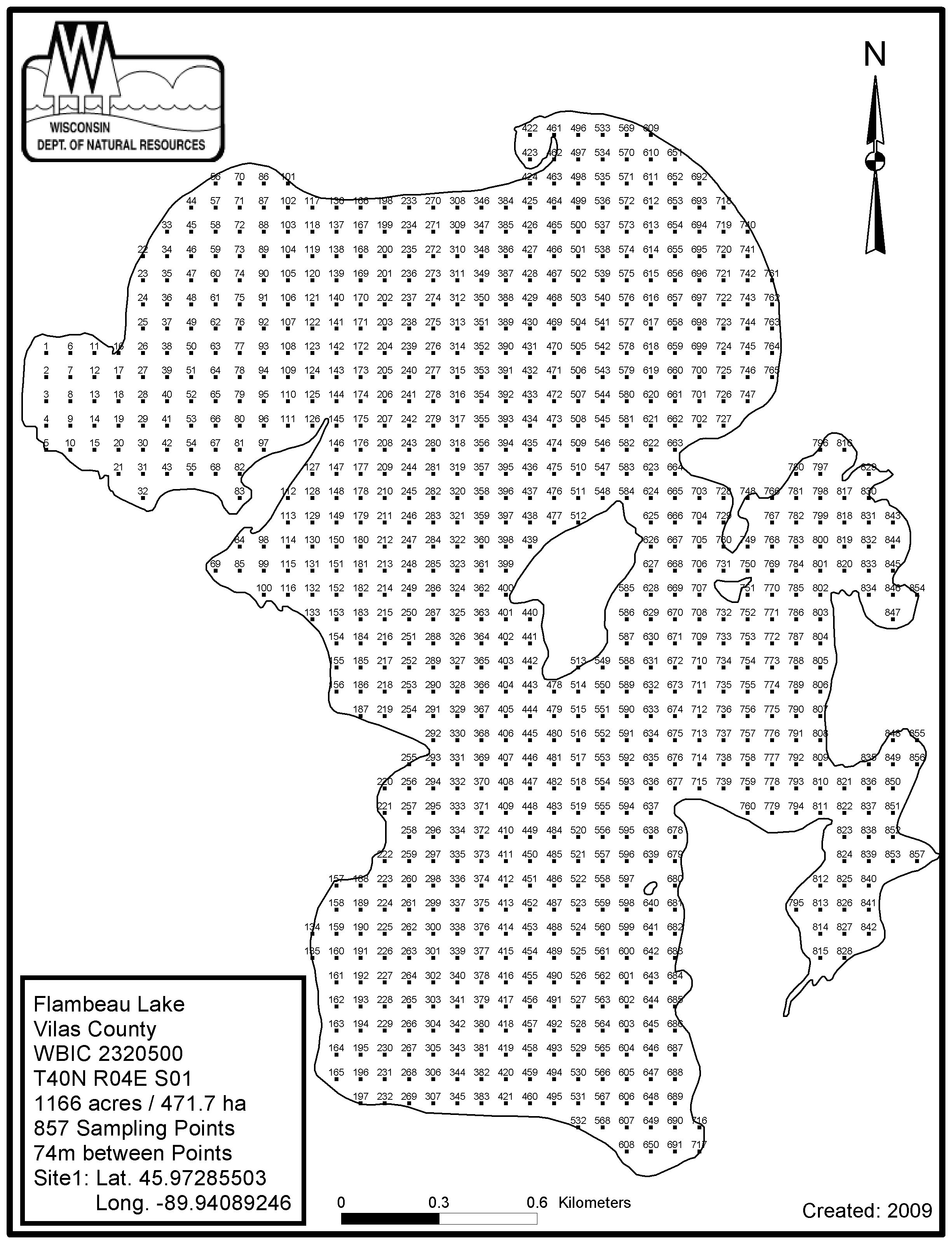 Flambeau Lake, Vilas County - Aquatic Plant Sampling Map (74 mpts)