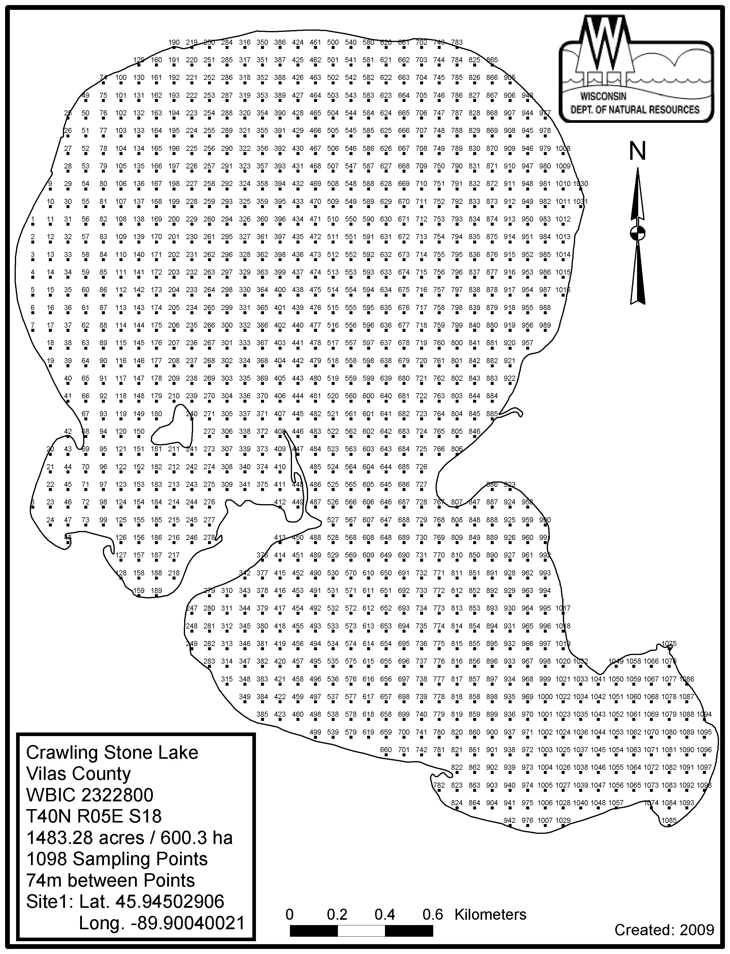 Crawling Stone Lake, Vilas County - Aquatic Plant Sampling Map (74 mpts)