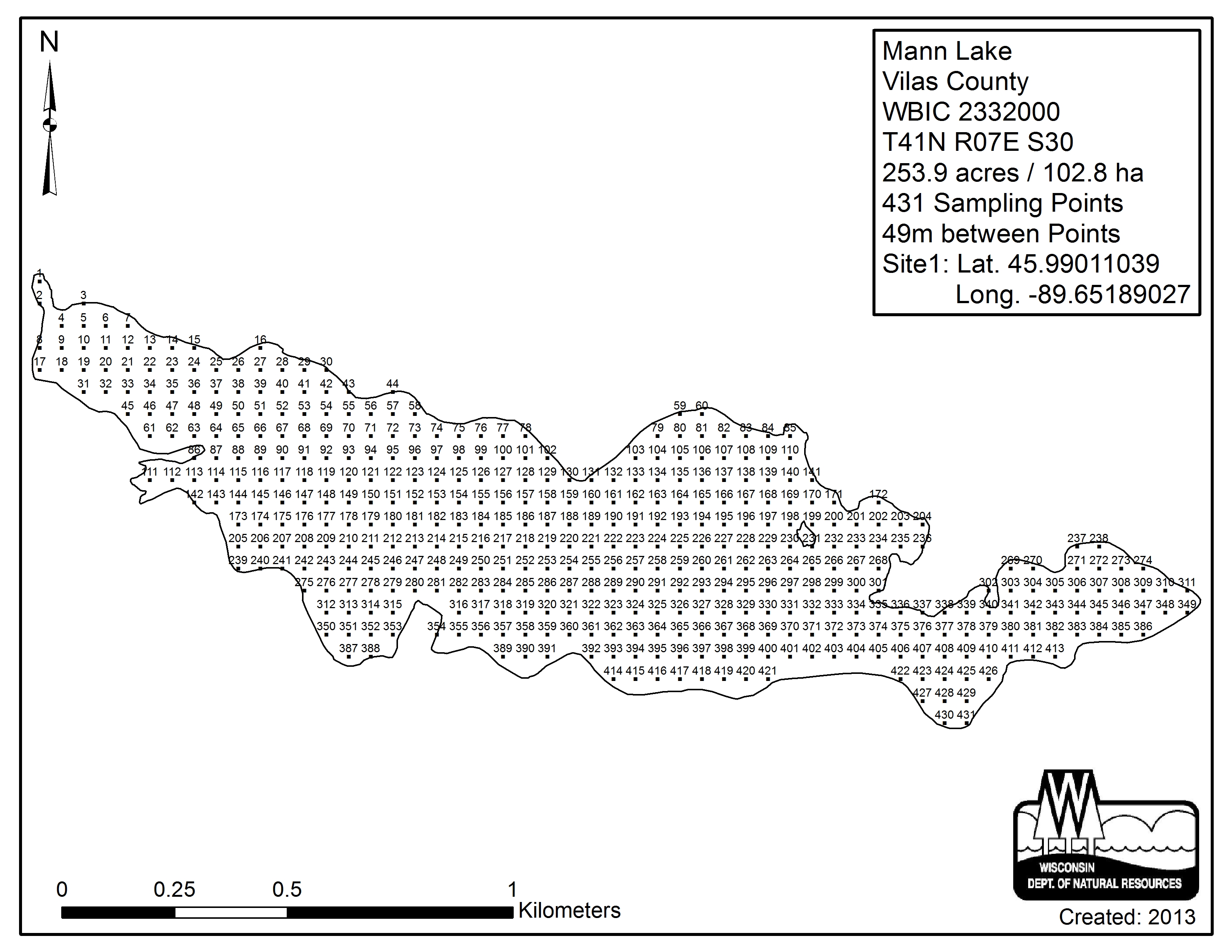 Mann Lake, Vilas County - Aquatic Plant Sampling Map (49 mpts)