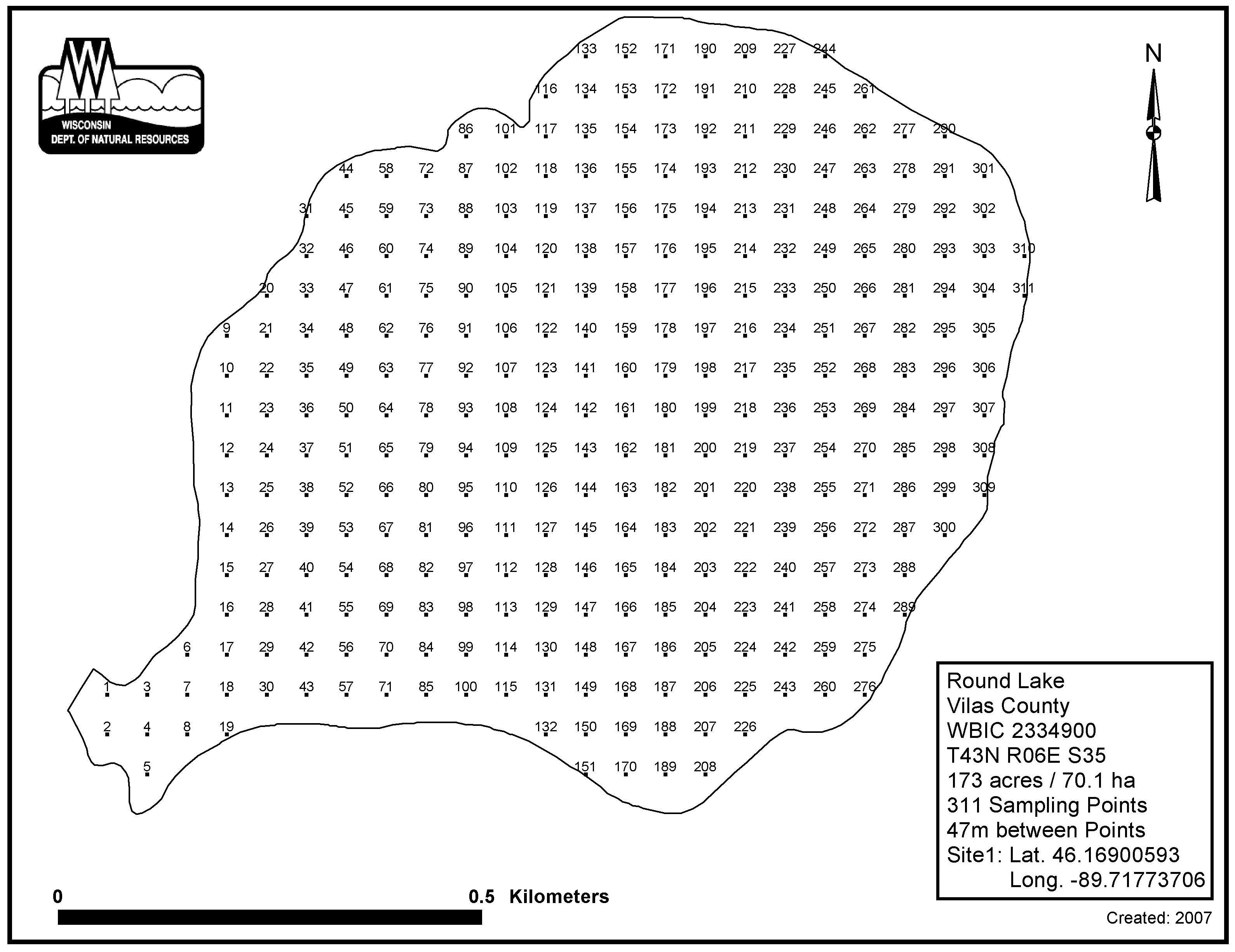 Round Lake, Vilas County - Aquatic Plant Sampling Map (47 mpts)