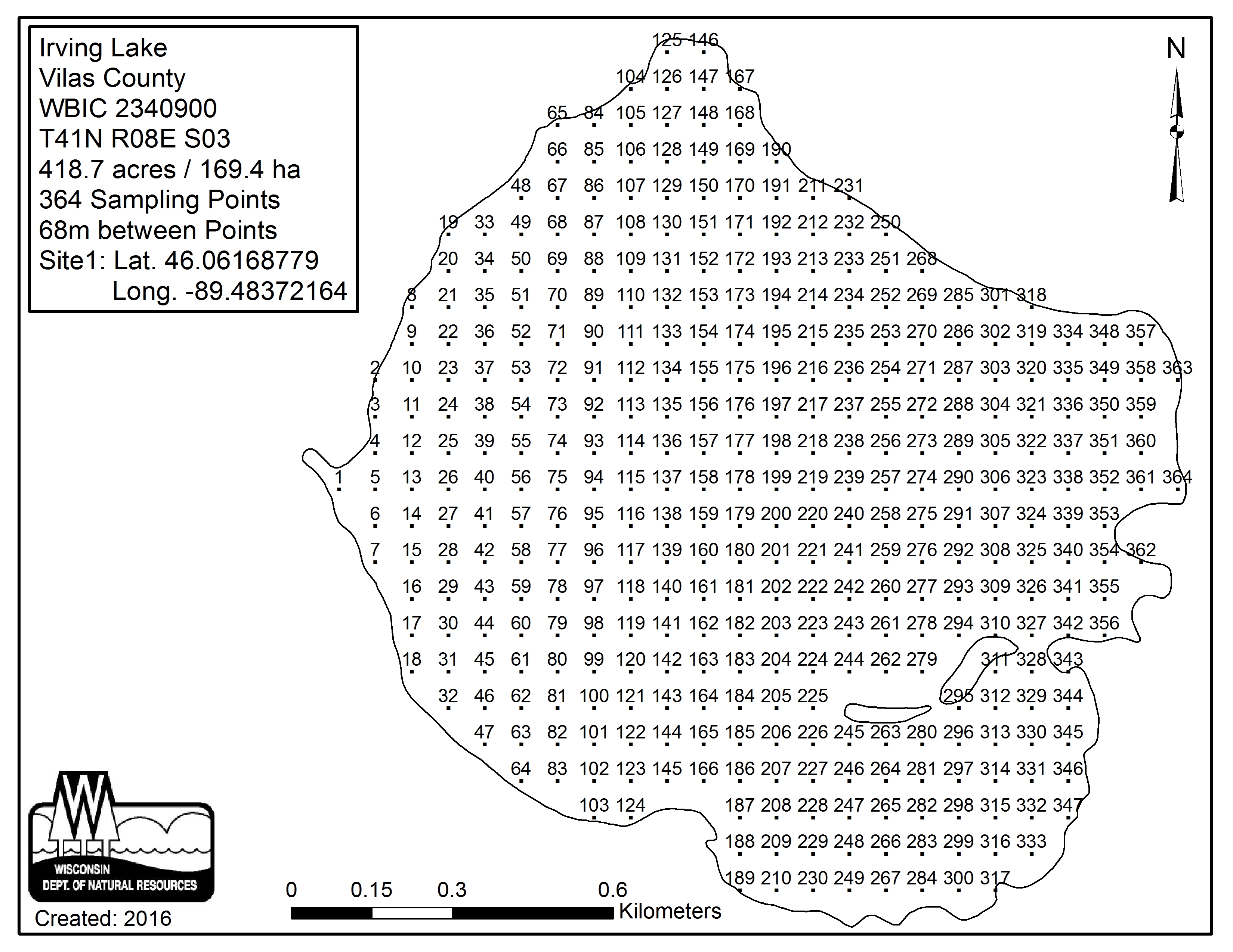 Irving Lake, Vilas County - Aquatic Plant Sampling Map (68 mpts)