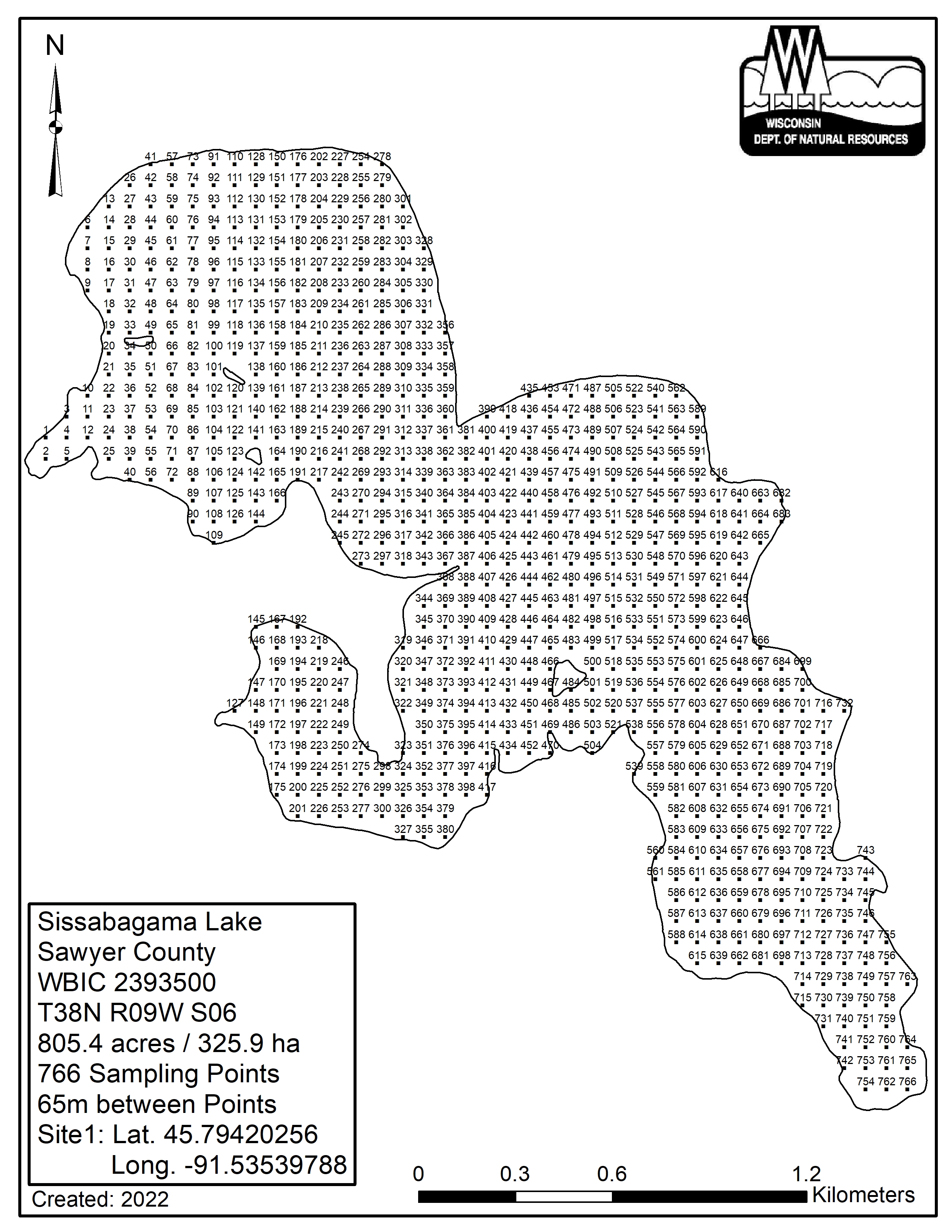 Sissabagama Lake, Sawyer County - Aquatic Plant Sampling Map (65 mpts)