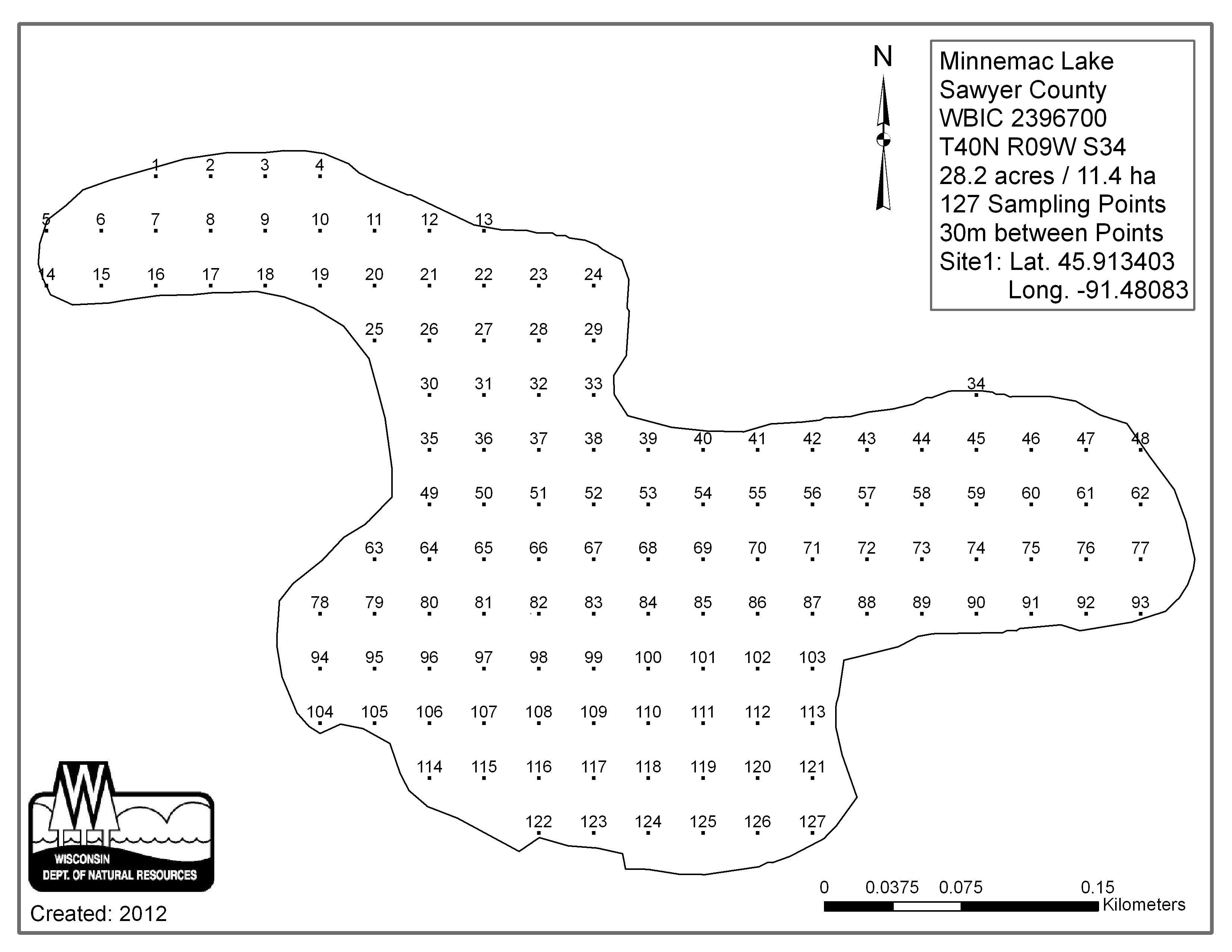 Minnemac Lake, Sawyer County - Aquatic Plant Sampling Map (30 mpts)