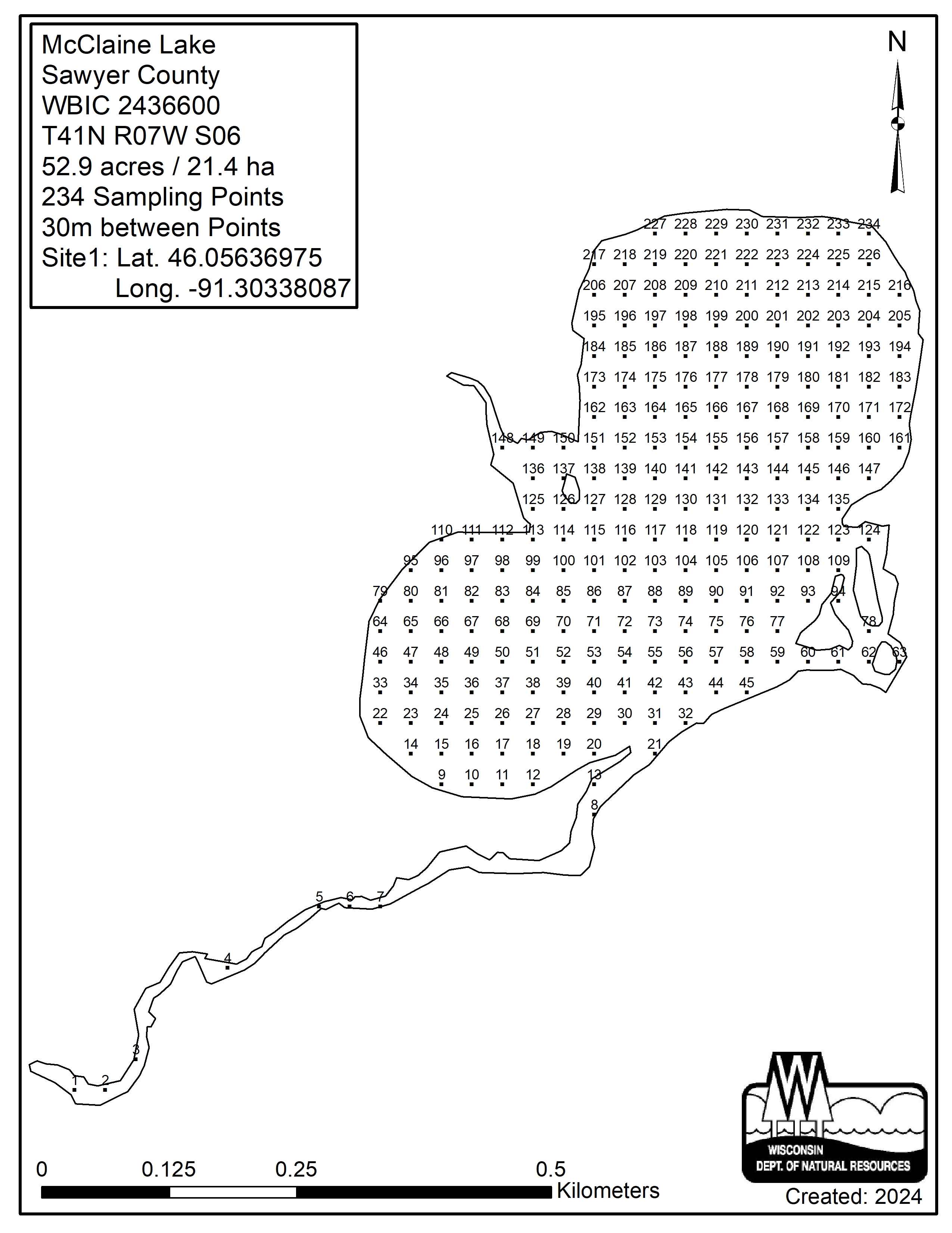 McClaine Lake, Sawyer County - Aquatic Plant Sampling Map (30 mpts)