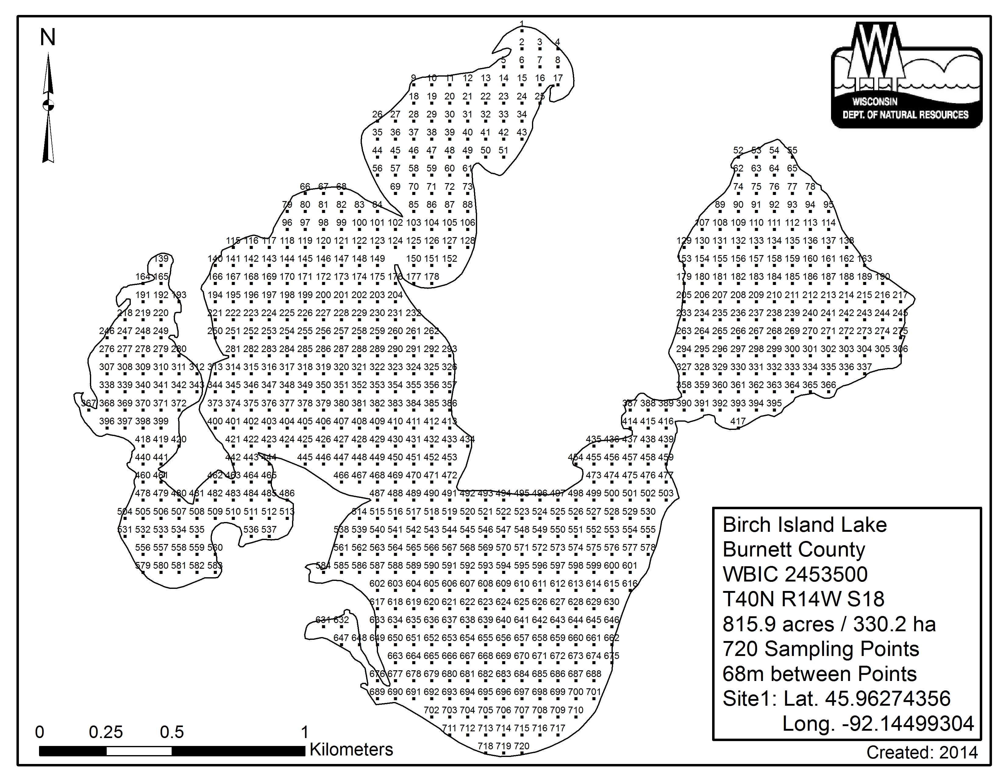 Birch Island Lake, Burnett County - Aquatic Plant Sampling Map (68 mpts)