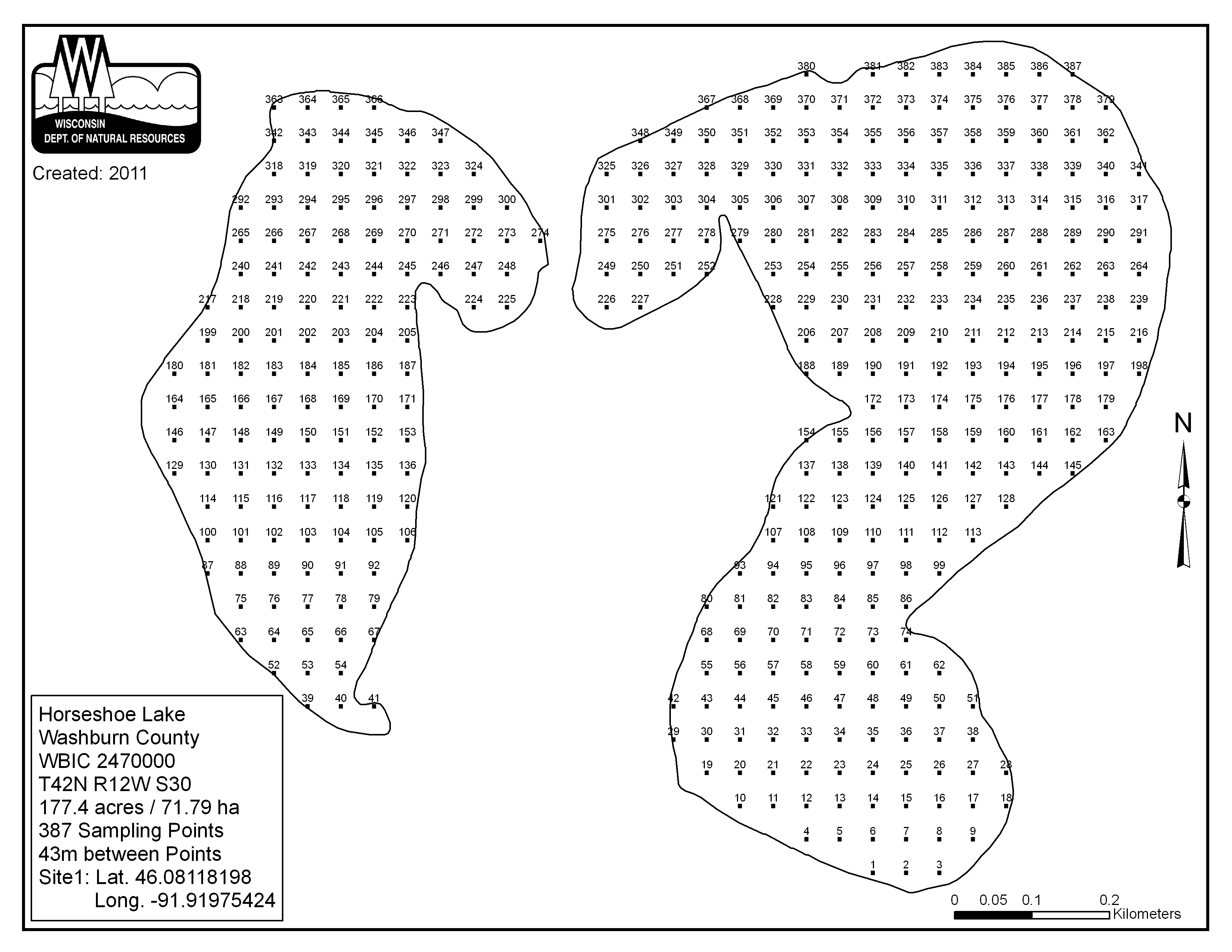 Horseshoe Lake, Washburn County - Aquatic Plant Sampling Map (43 mpts)