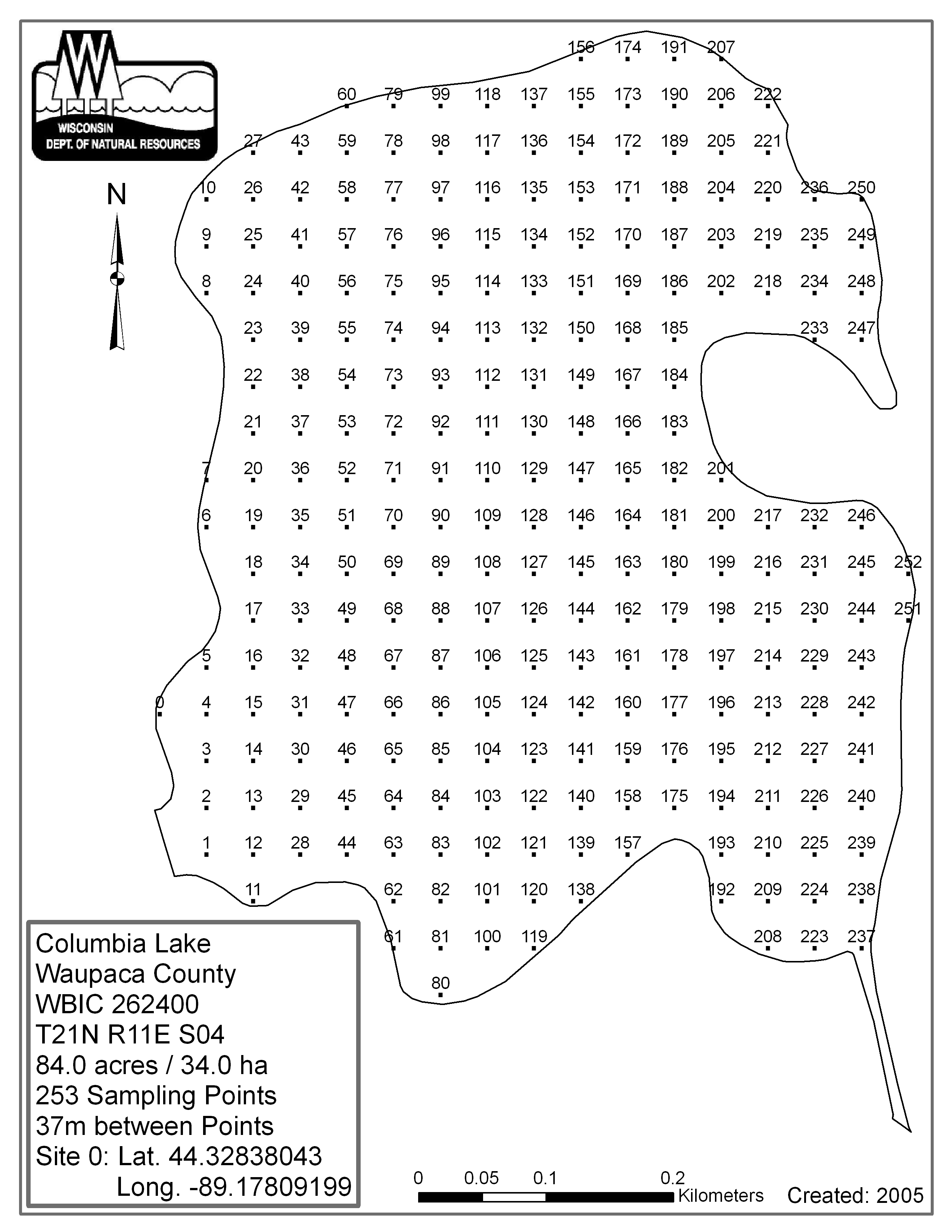 Columbia Lake, Waupaca County - Aquatic Plant Sampling Map (37 mpts)
